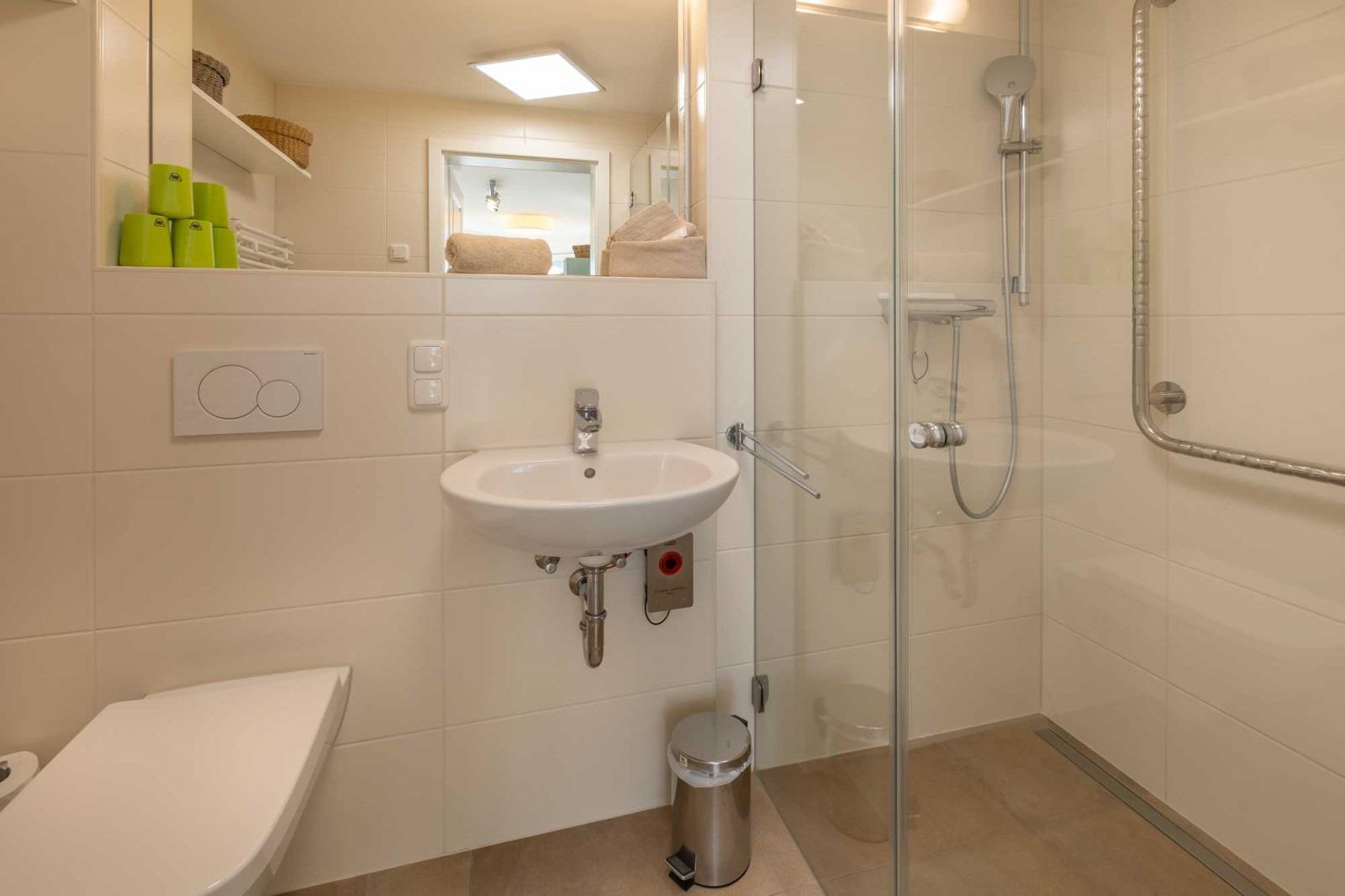 In der tollen Sauna können Sie wunderbar den Sorgen des Alltags entfliehen. Auch unsere Wellnessdusche ist ein echtes Highlight. Für Gäste mit einem körperlichen Handicap wurden im Gäste-WC Haltegriffe in der Dusche und für das WC-Becken installiert. Außerdem steht ein Duschhocker zur Verfügung.