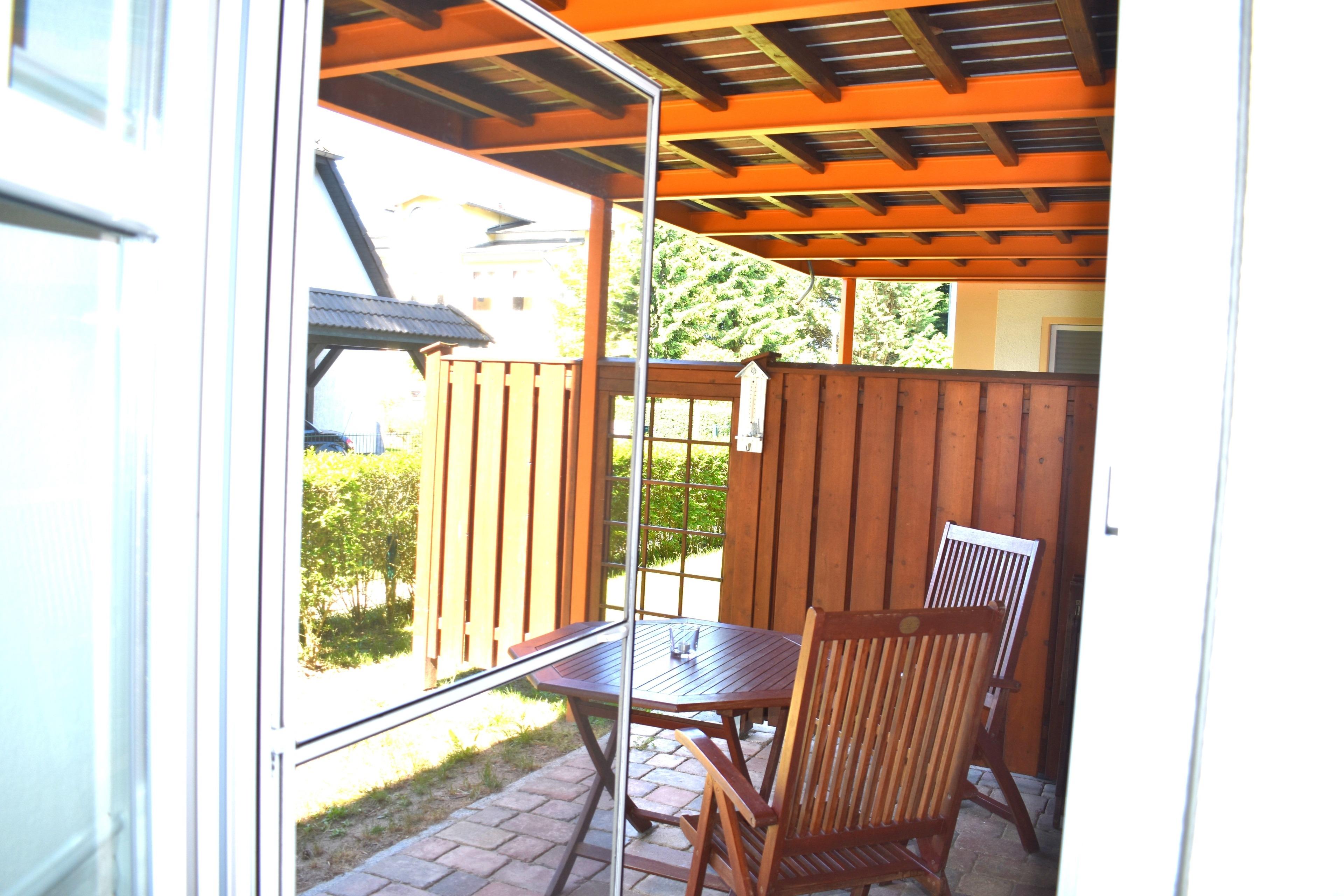Die Wohnung verfügt über eine überdachteTerrasse mit Tisch und Stühle.