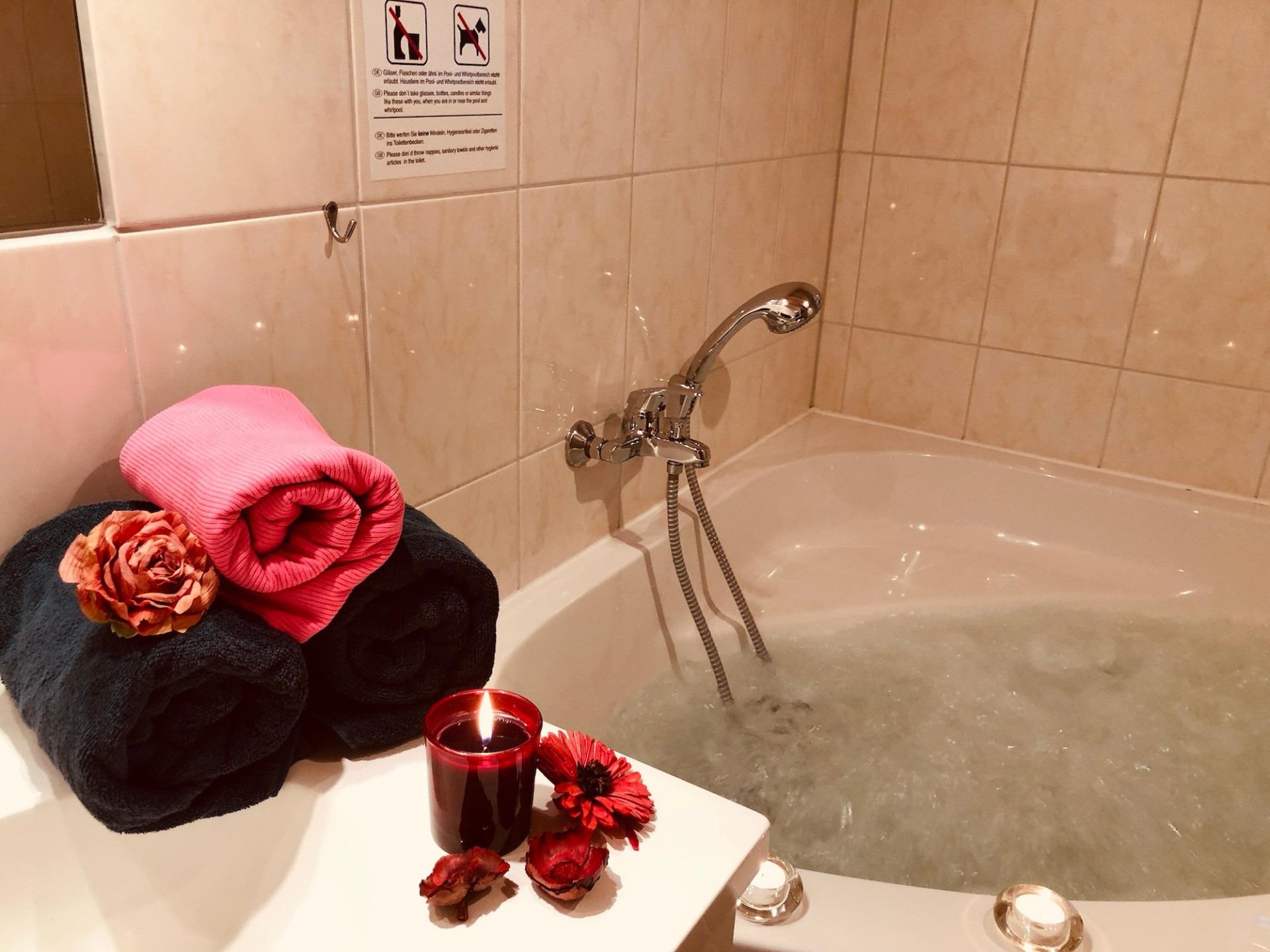 Das Badezimmer im Erdgeschoss ist ein echtes Highlight: Ein Wellnessbad mit Whirlpool, Sauna und separate Dusche lädt zum Entspannen ein.