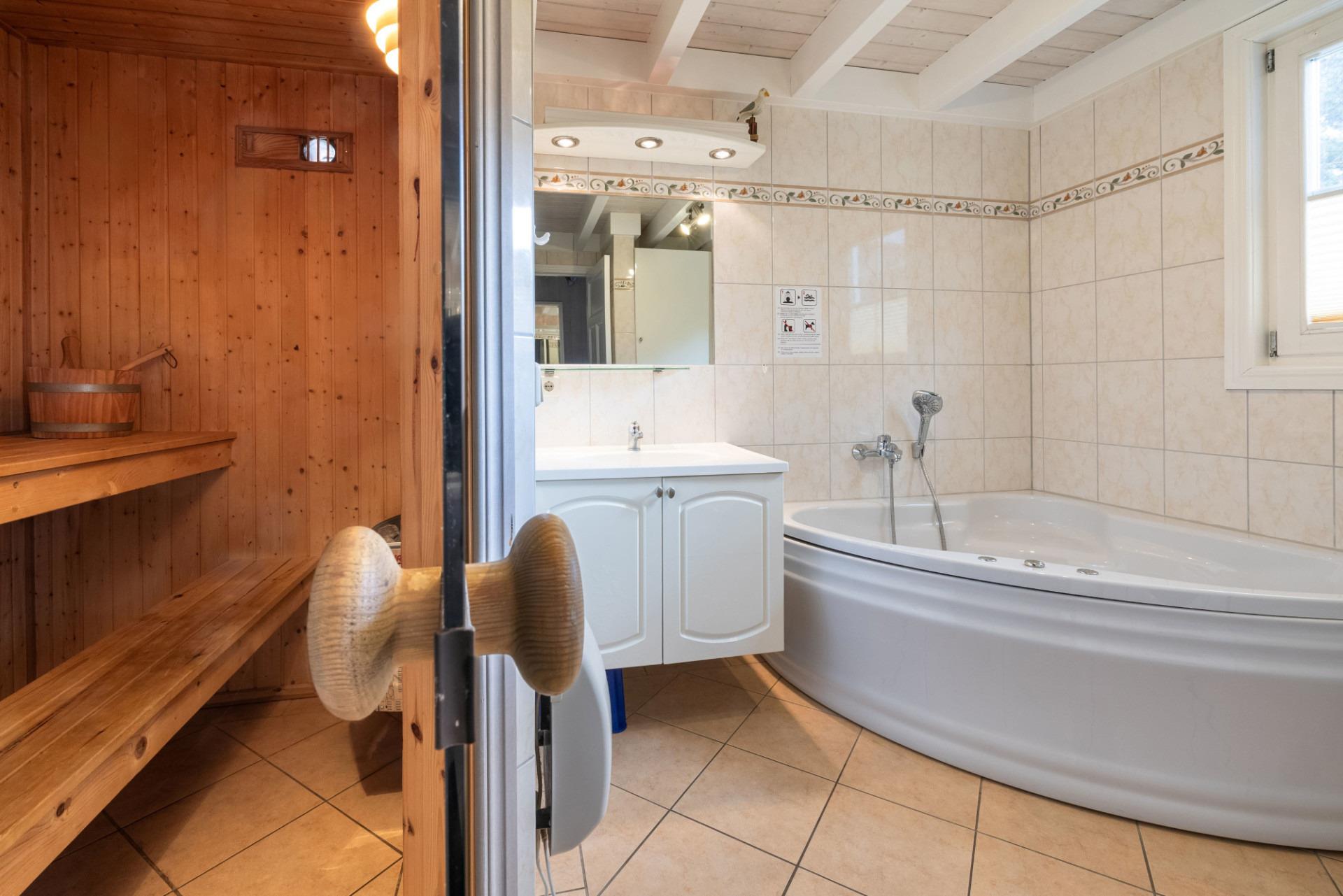 Ein Schlafzimmer mit Doppelt und ein Wellnessbad mit Sauna, Whirlpool, Dusche, WC und Waschmaschine runden das Erdgeschoss ab.