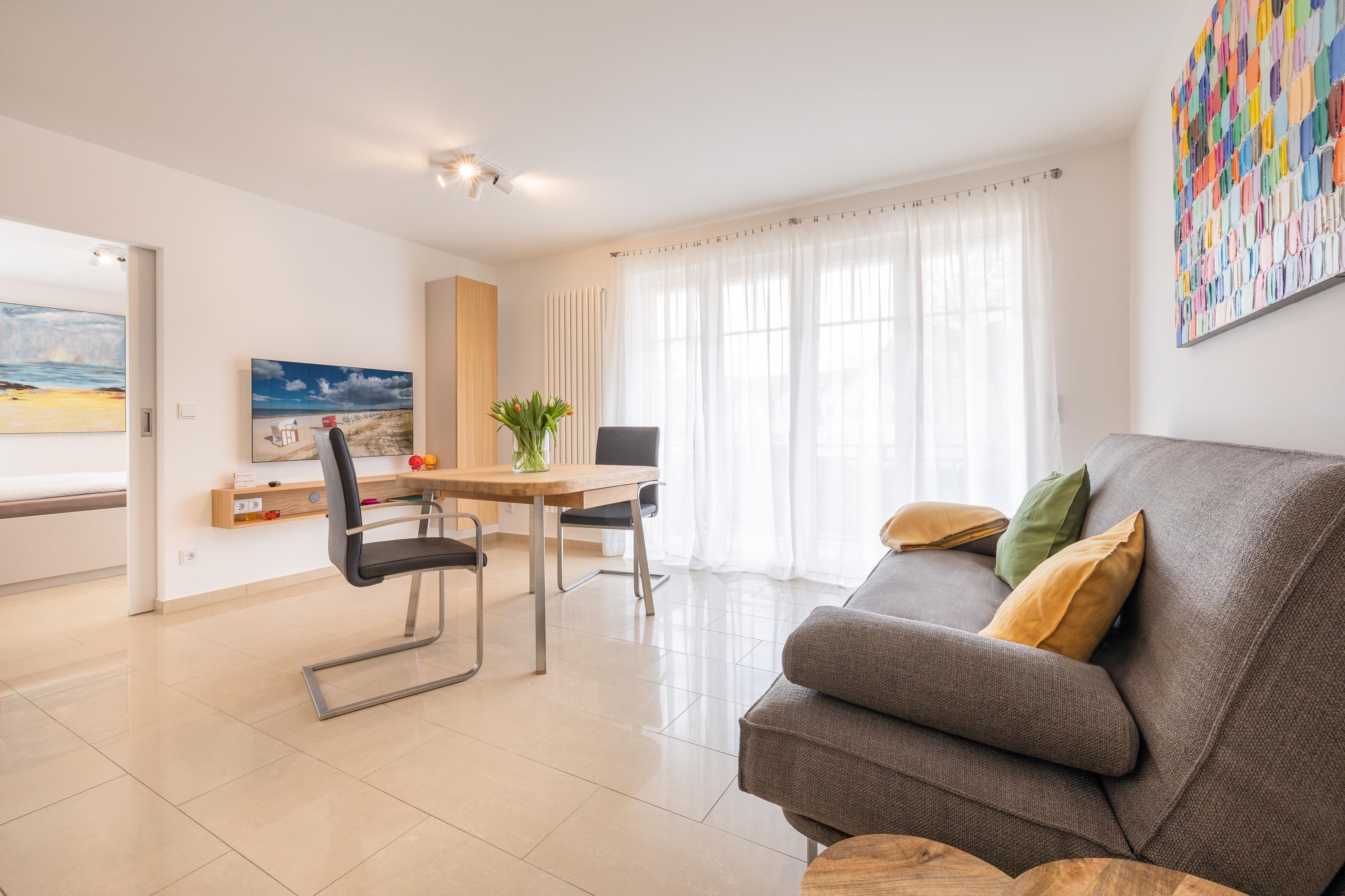Sehr geehrte Gäste, wir freuen uns Ihnen diese moderne Ferienwohnung im Herzen des Ostseebad Baabe anbieten zu können. Nur einen Steinwurf vom feinsandigen Ostseestrand entfernt genießen Sie kilometerlange Spaziergänge am Strand, Badeurlaub sowie die vielzelligen Restaurants in unmittelbarer Nähe. Bequem per Lift aus der Tiefgarage erreichen Sie den Eingang der Wohnung im ersten Obergeschoss. Modern eingerichtet und Ende 2023 frisch renoviert kann man sich hier ab der ersten Minute richtig wohlfühlen. Ein offen gestalteter Wohn,- Essbereich ist dabei ganz klar der Mittelpunkt dieser schönen Wohnung. Weiterhin erwartet Sie ein modernes Badezimmer sowie ein schön gestaltetes und großes Schlafzimmer. Sowohl vom Wohnbereich als auch vom Schlafzimmer erreichen Sie jeweils großzügige Balkone. So können Sie bereits am frühen Morgen, als auch noch am späten Abend die Sonne draussen genießen.