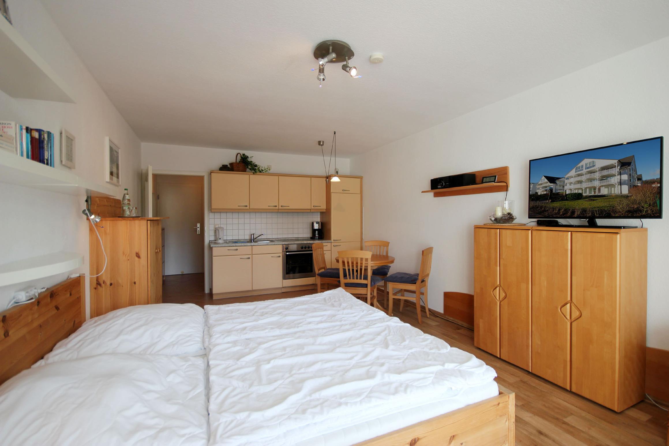 Ihre Ferienwohnung 56RB4 Hühnergott liegt im 1. Obergeschoss des Hauses. Sie verfügt über einen schönen Balkon in Richtung Osten mit Blick auf den Ort. Die ca. 40 qm große und gemütliche 1-Raum-Wohnung bietet 2 Personen Platz für einen angenehmen Aufenthalt. Neben einem kombinierten Wohn-/Schlafraum mit integrierter Küchenzeile verfügt das Appartement über einen geräumigen Flur und ein helles Badezimmer mit Waschtisch, Dusche, Haartrockner und WC. Im Wohn-/Schlafraum finden Sie neben der Sitzmöglichkeit ein großes Doppelbett sowie einen separaten Essplatz, Flachbild-TV und Musikanlage. Die Küchenzeile ist unter anderem mit Cerankochfeld, Backofen, Kühlschrank mit kleinem Gefrierfach und weiteren Küchenhelfern ausgestattet. All unsere Gäste können einen kostenfreien W-LAN-Zugang nutzen. Ein wohnungseigener PKW-Stellplatz befindet sich direkt hinter dem Haus.