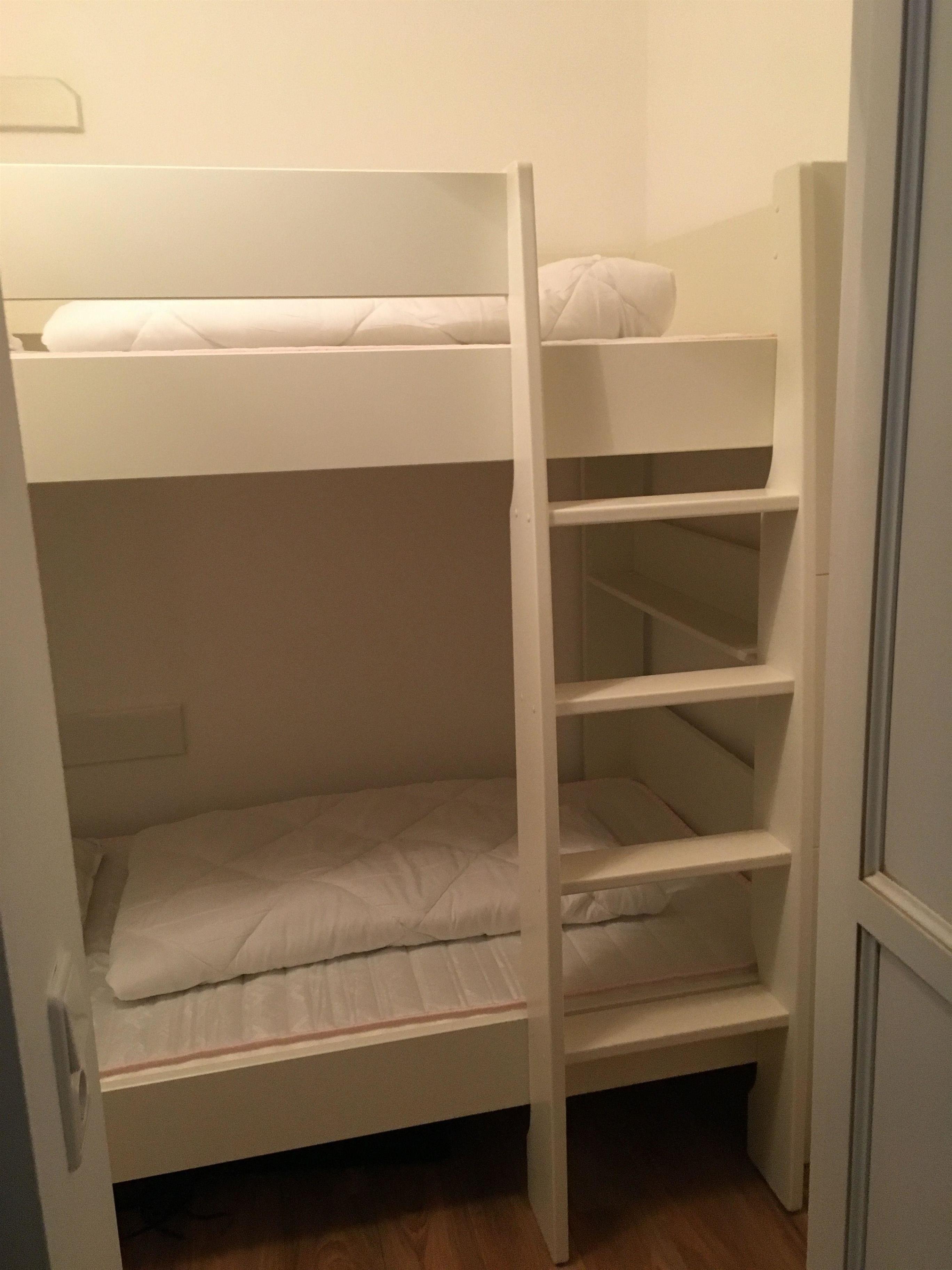 Das Hochbett steht in einer Schalfnische ohne Tür aber ohne Blickkontakt zum Wohn und Essbereich.