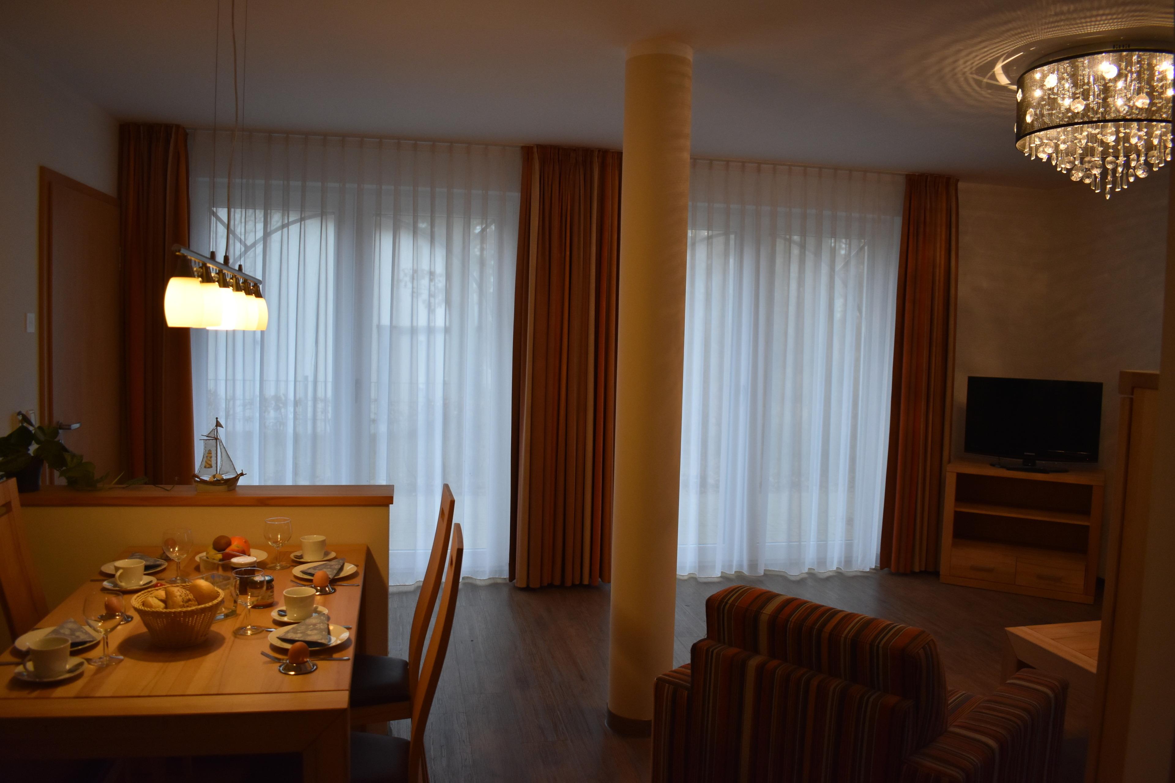 Das Wohnzimmer mit abgeteilter Küchenzeile und Esstisch ist sehr großzügig geschnitten. Es beinhaltet eine gemütliche Polstergarnitur und einen großen TV. Die großen Terrassenfenster bieten einen schönen Blick ins Grüne. Die 12qm große Terrasse die zur Wohnung gehört, ist mit modernen Terrassenmöbel und einem Strandkorb ausgestattet. Das Schlafzimmer ist mit einem großen Doppelbett und einem zweiten TV ausgerüstet. Das Bad ist modern und zweckmäßig hergerichtet.