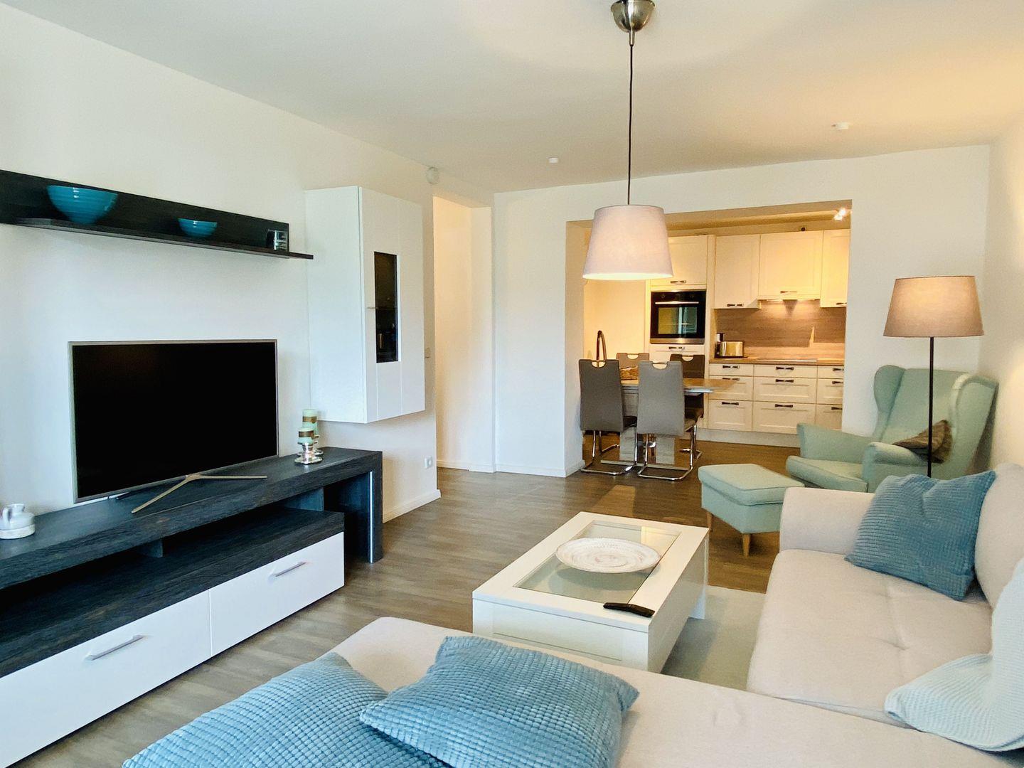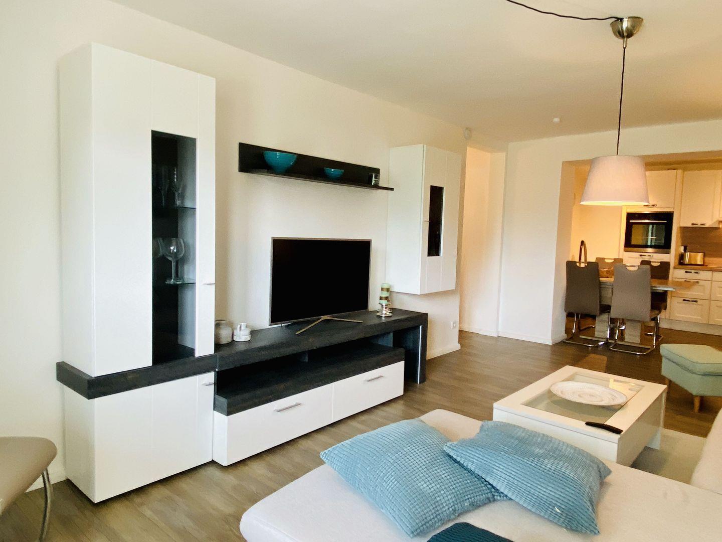 Der Esstisch bietet genügend Platz für bis zu 4 Personen. Von hieraus kann man das Wohnzimmer betreten, welches mit Eckcouch, Stehlampe, Sideboard und großem Flachbild TV zu schönen Abenden einlädt.