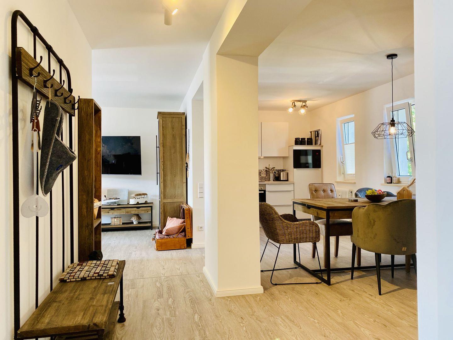 Der Esstisch ist aus Holz und bietet genügend Platz für bis zu 6 Personen. Von hieraus kann man das Wohnzimmer betreten, welches mit chilligem Sessel, Schaukelstuhl, Couch, Tripodlampe, Sideboard und großem Flachbild TV zu schönen Abenden einlädt.