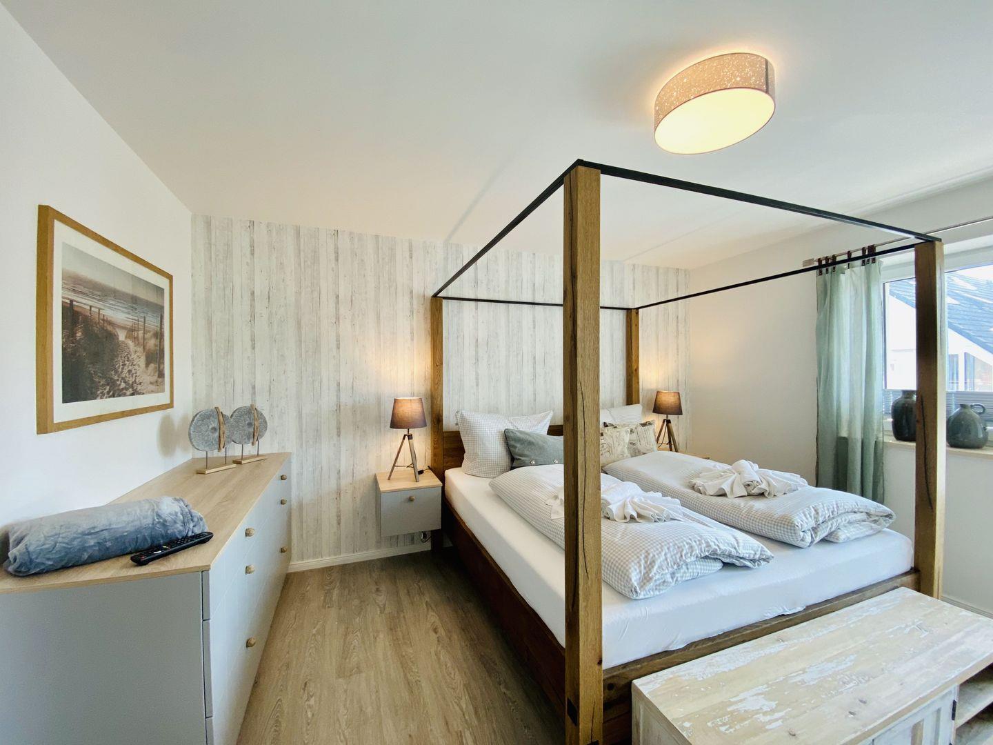 Die beiden großen Schlafzimmer der Ferienwohnung "Weltenbummler" sind mit bequemen Boxspringbetten (180x200m), Nachttischen, Kleiderschrank oder Kommode, Ablagemöglichkeit und Smart-TV ausgestattet. Ein Zugang zum Balkon ist ebenfalls durch die Balkonfenster der beiden Schlafzimmer gegeben.