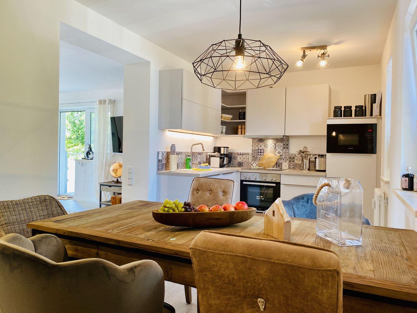 Der Wohnraum beginnt mit einer großen Eckküche, die überaus gut ausgestattet ist und zu geselligen Kochabenden mit der Familie einlädt. Für Frühstück, Mittag und Abendbrot ist die Ausstattung der Küche ideal ausgelegt. Auch Backzubehör ist vorhanden. An Elektrogeräten findet der Gast hier neben Geschirrspüler, Waschmaschine, Backofen und Kühlschrank mit Gefrierfach auch Kleingeräte wie Wasserkocher, Kapselmaschine für Kapseln der Marke Nespresso, Filterkaffeemaschine, Toaster und Rührbesen sowie eine Mikrowelle.
