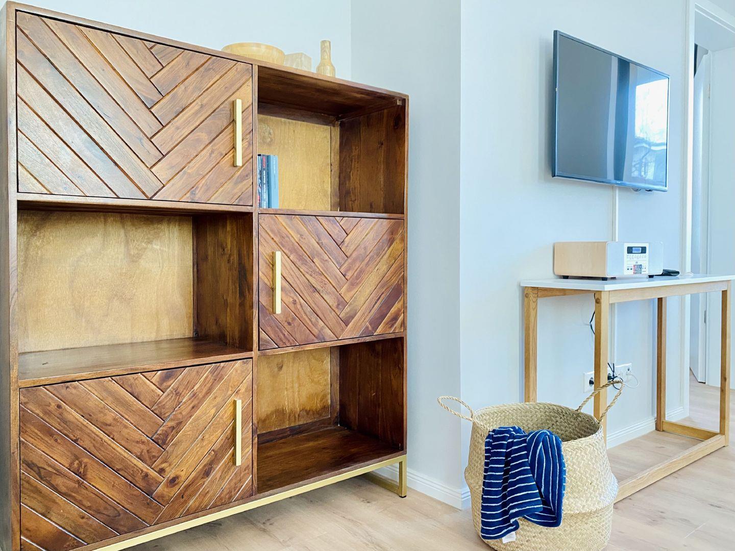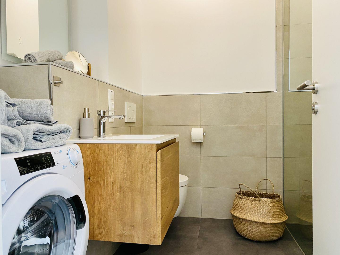 Ein Schlafzimmer mit bequemen Boxspringbett und Deckenventilator und ein Badezimmer mit ebenerdiger Regendusche und Waschmaschine ergänzen das richtige Urlaubsambiente. Ein PKW-Stellplatz in der hauseigenen Tiefgarage und kostenfreies WLAN stehen Ihnen während des Urlaubs zur Verfügung.