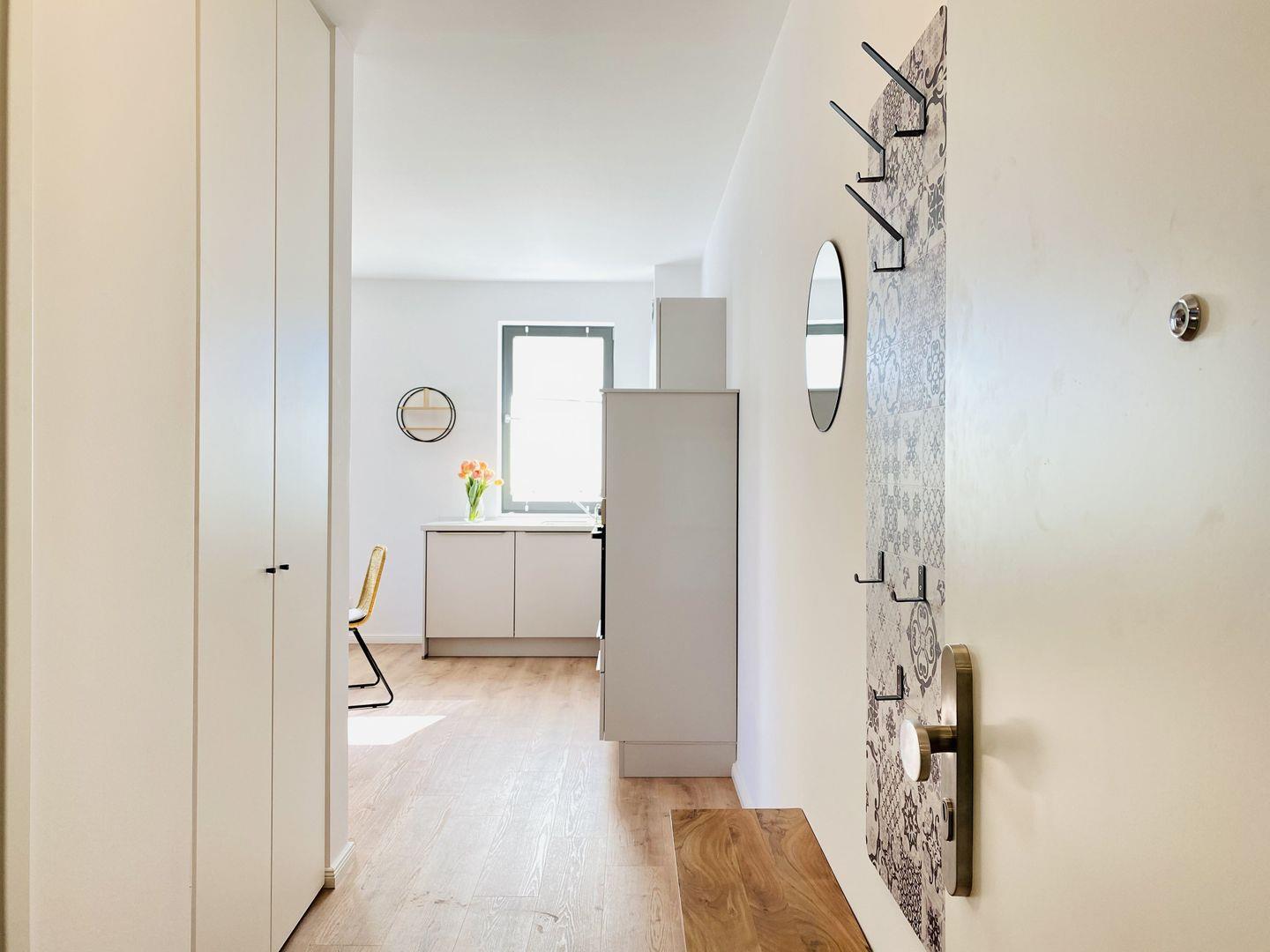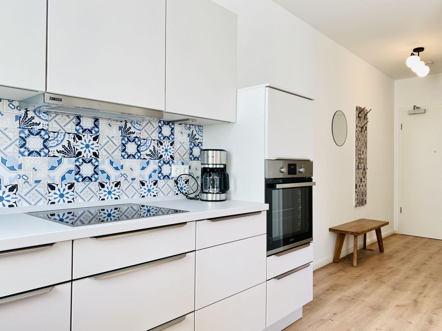 Genießen Sie entspannte Stunden im gemütlichen Wohnbereich mit Eck-Couch, Musikanlage und Smart-TV und Balkonzugang. Die Küche ist mit Filterkaffeemaschine, Wasserkocher, Toaster, Mixer, Geschirrspüler, Backofen, Kühlschrank, Gefrierfach und Kochfeld ausgestattet und bietet die perfekte Grundlage für einen geselligen Kochabend oder ein ausgedehntes Urlaubsfrühstück. An den Wohnbereich schließt sich die offene und komplett ausgestattete Küchenzeile mit Essbereich an. Von hier kann man den nach Osten ausgerichteten Balkon, ausgestattet mit Tisch und klappbaren Lehnstühlen betreten.