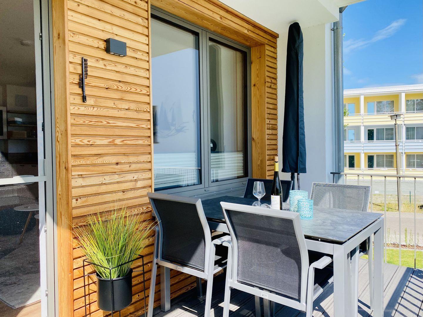 Moderne Möblierung mit maritimen Stilelementen erwartet Sie in der Ferienwohnung Strandloper im 1. Obergeschoss der Villa Candela in Baabe. Die 63 m² große Ferienwohnung ist für 2-6 Personen geeignet. In allen Räumen lassen sich hübsche Details entdecken, die den Urlaub hier zu einem traumhaften Erlebnis werden lassen. Genießen Sie ruhige Stunden im gemütlichen Wohnbereich mit großer Couch, Smart-TV, Esstisch mit bequemen Stühlen. Von hier kann man den nach Süden ausgerichteten großzügigen Balkon betreten, der bei optimaler Sonnenausrichtung für den Morgenkaffee sowie gemütliche Abendstunden geeignet ist. An den Wohnbereich schließt sich die offene und komplett ausgestattete Küchenzeile an. Die Küche ist mit Kaffeemaschine, French Press Kaffeebereiter, Wasserkocher, Toaster, Geschirrspüler, Backofen, Kühlschrank, Gefrierfach, Kochfeld und Mikrowelle ausgestattet und bietet die perfekte Grundlage für einen entspannten Kochabend oder ein ausgedehntes Urlaubsfrühstück.