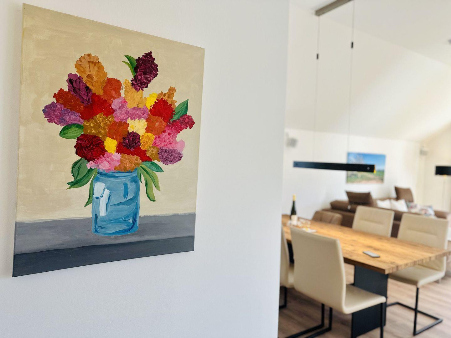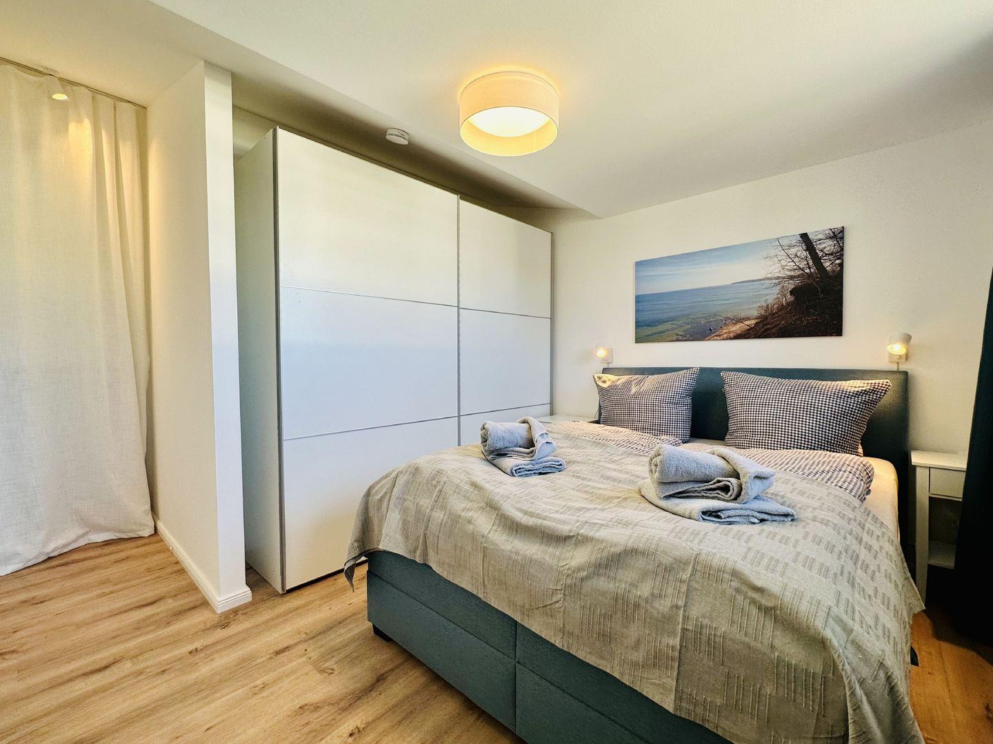 Im Wohn-/Esszimmer befindet sich ein Massivholztisch mit 6 teilweise lederbezogenen Stühlen, ein Couchtisch und ein sehr bequemes Sofa, sowie 55“-OLED-Smart-TV mit Sonos-Soundbar, sowie ein Stereopaar Sonos-Lautsprecher. Die moderne Einbauküche ist mit Backofen, Kühlschrank mit Gefrierfach, Spülmaschine ist hochwertigem Inventar (u.a. WMF-Besteck, BSF-Messerblock, Kaffeepad-Maschine (Senseo), Wasserkocher etc.) ausgestattet. Bitte beachten Sie, dass die Kaffee-Pads für die Senseo-Maschine nicht Teil der Ausstattung sind. An den Fenstern besteht Sichtschutz durch Gardinen und Plissees. In den Schlafzimmern stehen Boxspringbetten (180x200 cm, 160x200cm) mit Beistelltischen und separater Beleuchtung und je ein Kleiderschrank zur Verfügung. Abdunkelung findet über lichtdichte Vorhänge statt. An relevanten Fenstern befindet sich Insektenschutz.