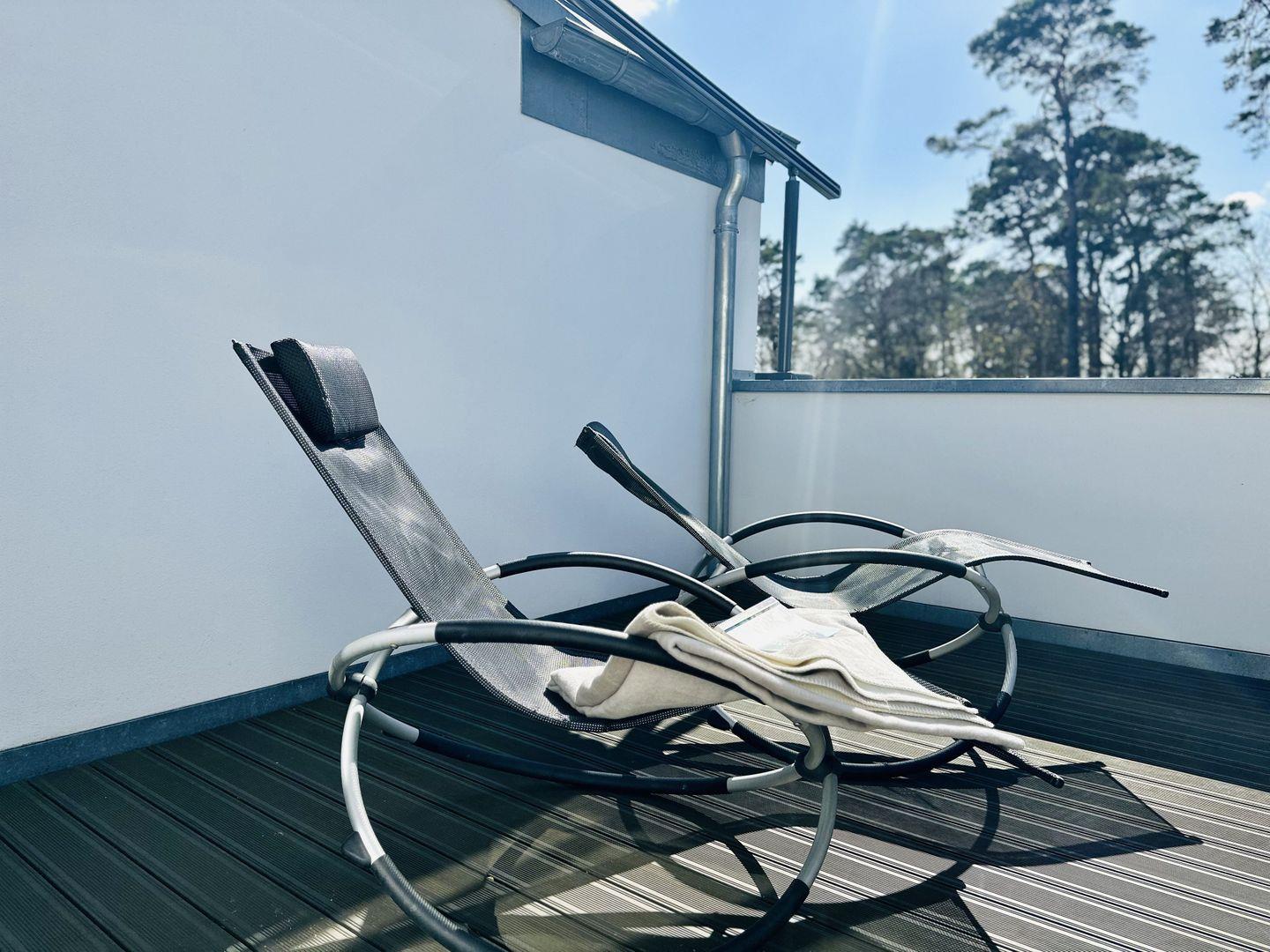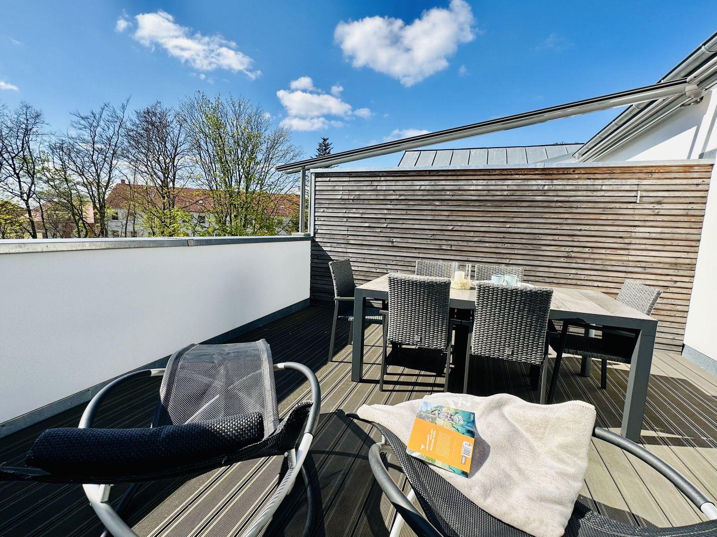 Selbstverständlich steht kostenfreies schnelles WLAN zur Verfügung, über das u.a. per Sonos-App Musik gestreamt werden kann. An einer Ladestation können Mobilgeräte geladen werden. Die mit WPC ausgelegte großzügige Dachterrasse bietet mit Gartenmöbeln Platz für bis zu 6 Personen. Im Kellerraum haben Sie die Möglichkeit Strandgeräte, Fahrräder etc. einzuschließen. Es erwartet Sie ein leckerer Begrüßungswein.