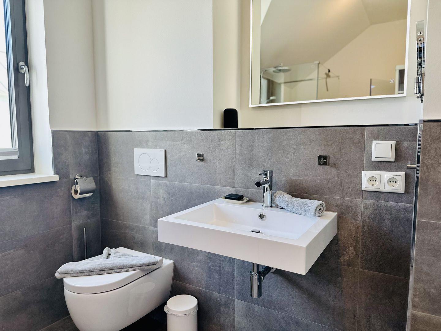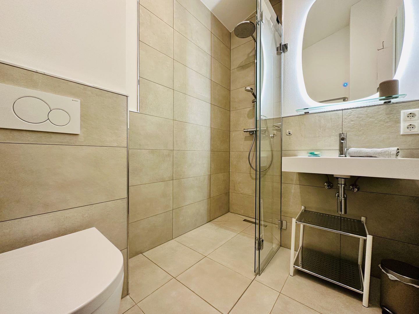 erreichen Sie die einzelnen Räume. Alle Räume sind mit separat regulierter Fußbodenheizung ausgestattet. Das große Bad beinhaltet neben Waschbecken und Toilette eine große Klarglas-Dusche mit Regenduschkopf, einen beheizten und beleuchteten Spiegel, Kosmetikspiegel, Handtuchheizung, Fön und eine Infrarotkabine. Das kleinere Bad ist mit Waschbecken, Toilette, ebenerdiger Dusche und beheiztem und beleuchtetem Spiegel ebenso vollständig eingerichtet.