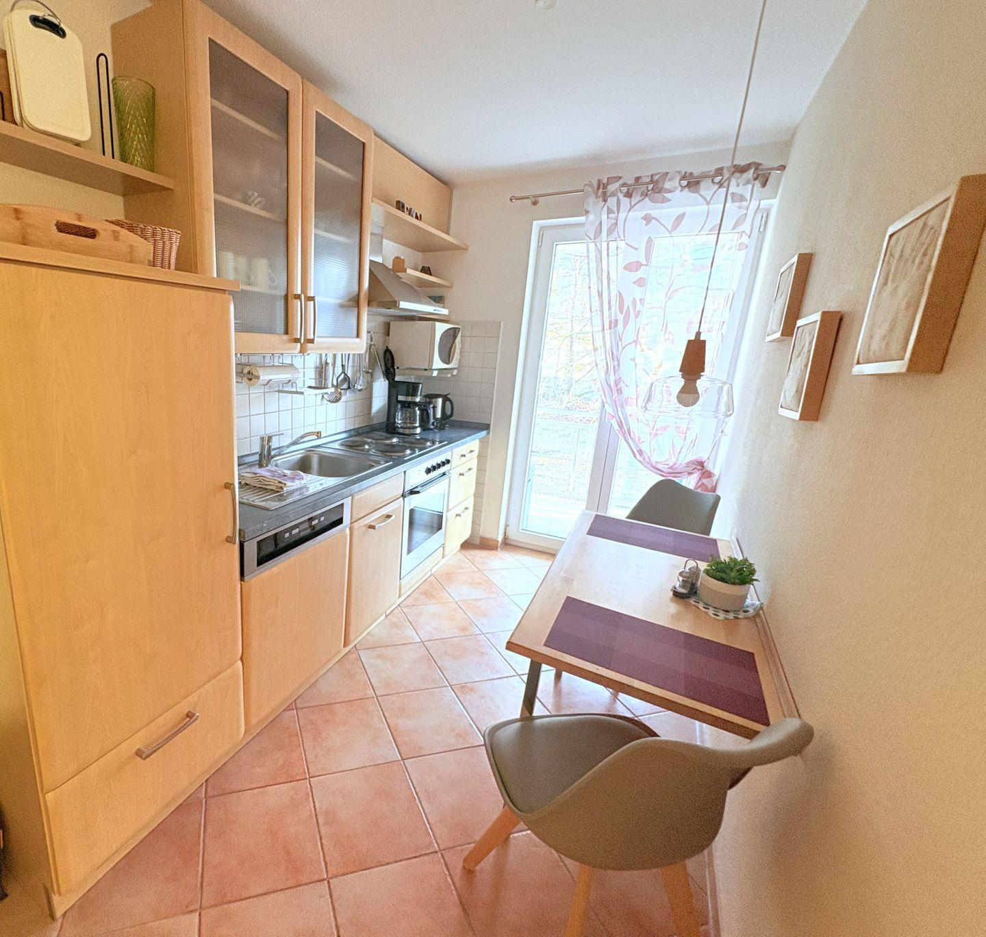 Der separate Bereich mit Küchenzeile bietet ausreichend Platz für 2-3 Personen. Besonders der Ostbalkon lädt bereits morgens zum Frühstück im Sonnenschein ein. Bis in den Abend können Sonnenfreunde auf dem zweiten Balkon am Wohnzimmer die Sonne genießen.
