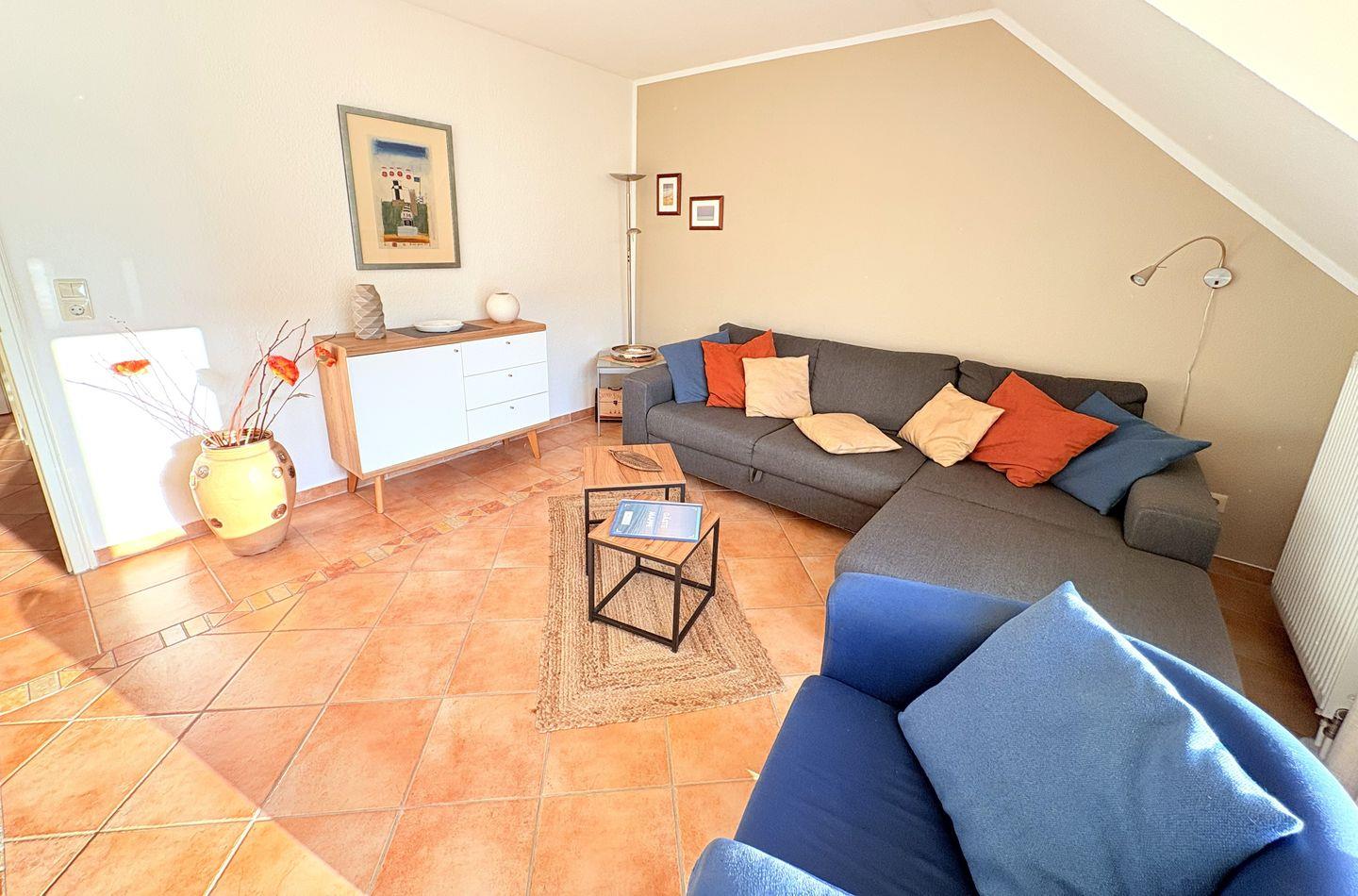 Im Wohnzimmer befindet sich eine Schlafcouch mit einer Fläche von 160x200 cm.
