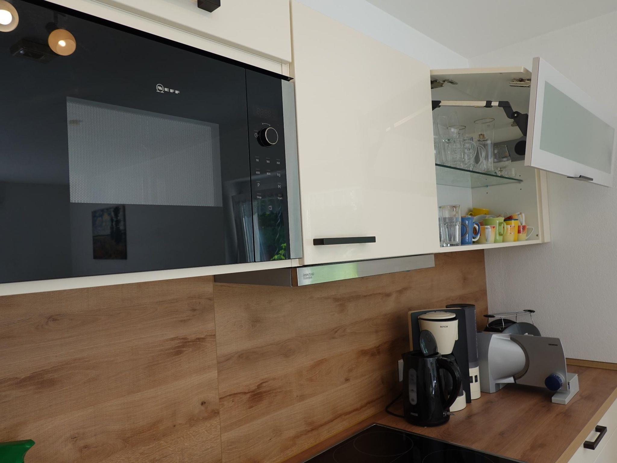 In der gemütlichen Wohnküche befinden sich eine Küchenzeile mit einem Esstisch für drei Personen, ein weiterer Kleiderschrank, ein drittes Bett, welches man auch als Couch benutzen kann (90 x 200 cm), eine Ledercouch, ein Flachbild-TV und eine Vitrine mitsamt einer Spielesammlung. Die Küchenzeile ist mit einem Geschirrspüler, einem Kühlschrank, einem Gefrierschrank, einem Herd, Backofen, Mikrowelle, Wasserkocher, Eierkocher, Toaster, Brotschneidemaschine und einer Filterkaffeemaschine ausgestattet.