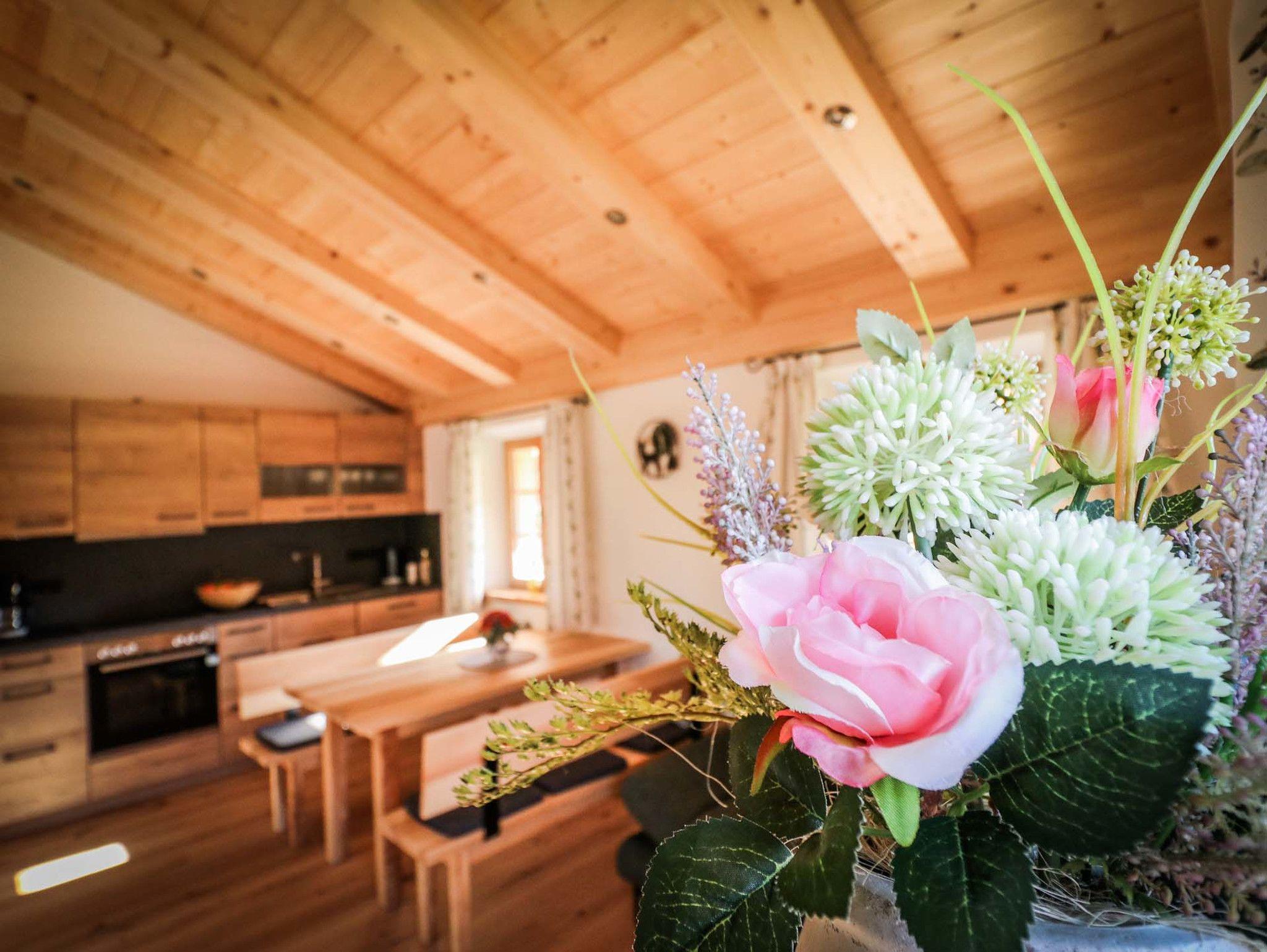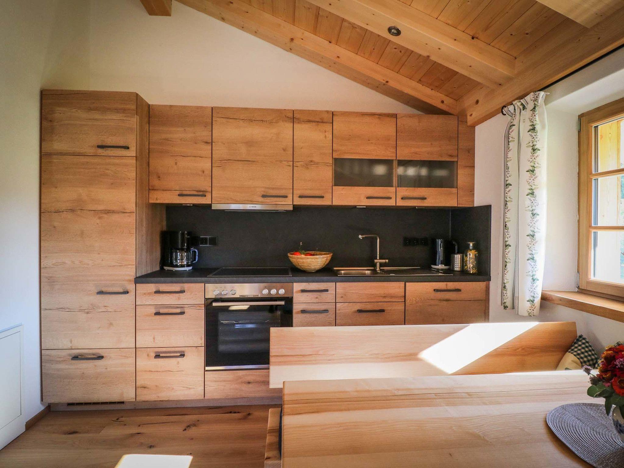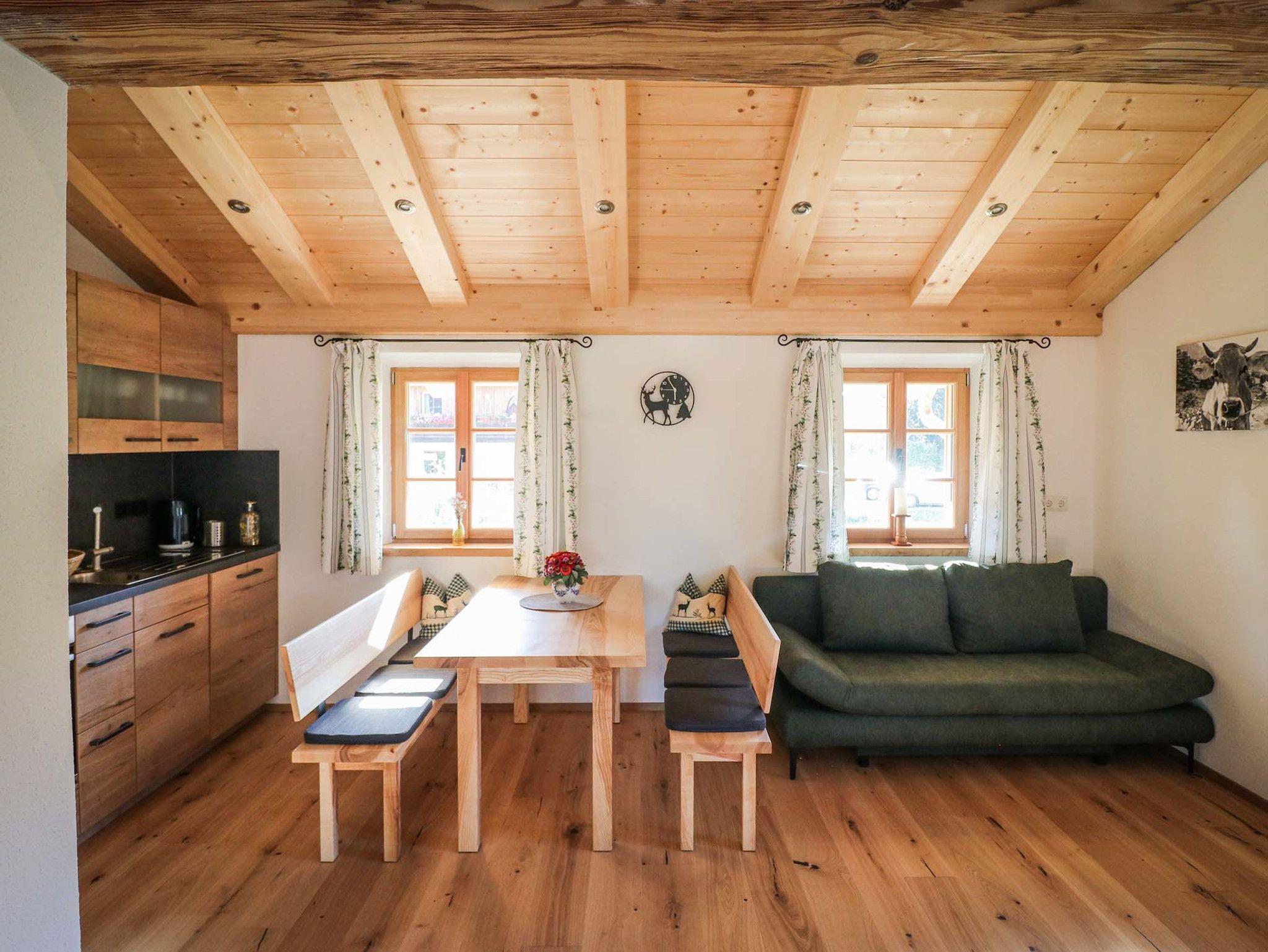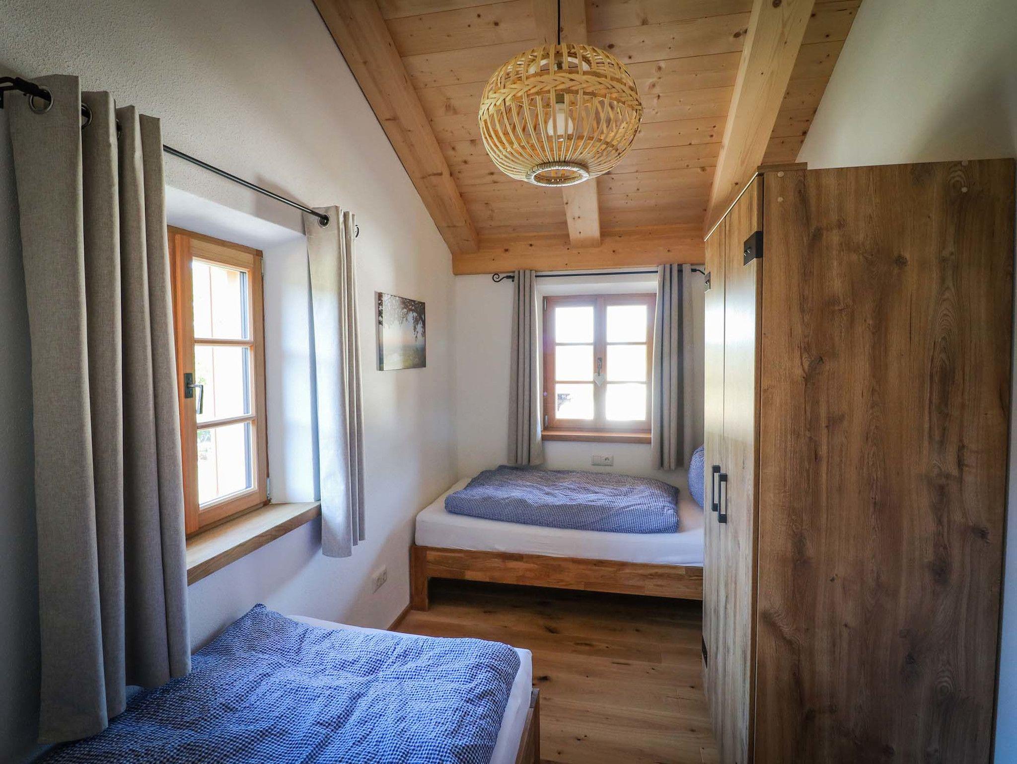 Unsere 2022 neu gebaute Ferienwohnung befindet sich im hinteren Teil eines ländlichen Massivholzhauses mit separatem Eingang. Die Ferienwohnung im Obergeschoss mit großzügigem Eingangsbereich mit Garderobe und Sitzbank bietet ausreichend Stauraum für Ihr Gepäck. Die hochwertig ausgestattete Wohnküche (Backofen, Geschirrspülmaschine, Kühlschrank inkl. Gefrierfach, Kaffeemaschine, Wasserkocher, Toaster, geschreinerte Sitzgarnitur, Schlafcouch, Smart-TV)lädt zum Kochen und gemütlichem Beisammensitzen ein. Im modern eingerichteten Badezimmer mit Dusche/WC stehen Ihnen Handtücher, ein beleuchteter Spiegelschrank und ein Haartrockner zur Verfügung. Besonderen Komfort bieten die hochwertigen Matratzen in den beiden Schlafzimmern. Ein Schlafraum ist mit einem Doppelbett (180 x 200 cm), 3-türigem Schrank und einem Flachbildfernseher ausgestattet. Das zweite Schlafzimmer verfügt über zwei Einzelbetten (90 x 200 cm) und einem 2-türigem Schrank. Im Außenbereich lädt ein Balkon mit Gartenmöbeln zum Verweilen ein.