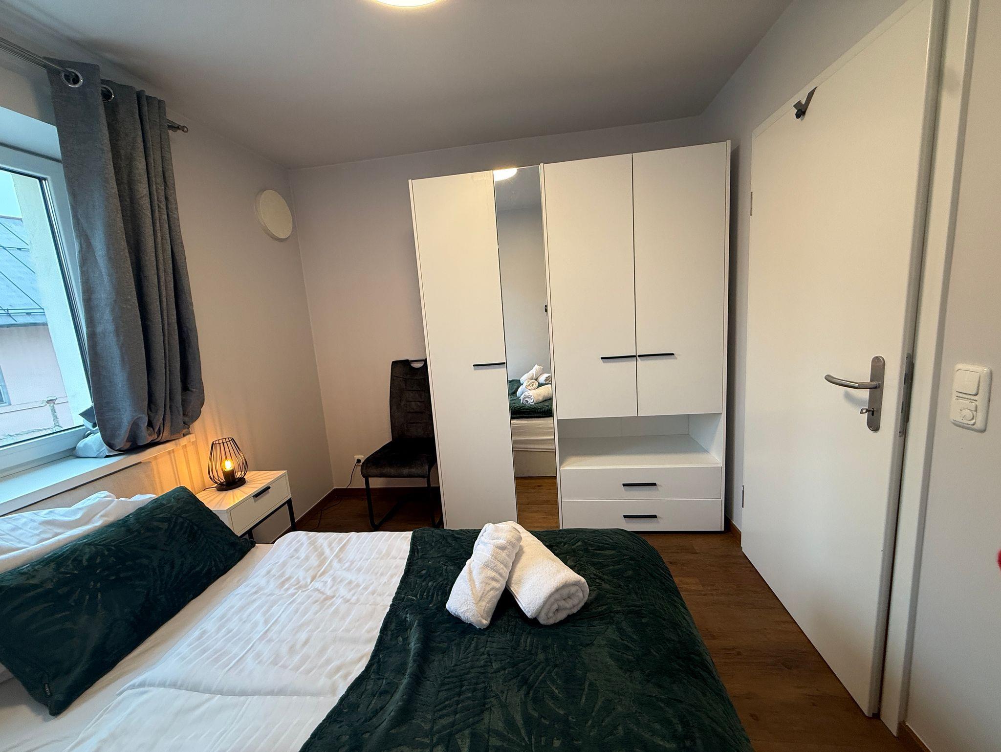 Diese komplett möblierte 1,5-Zimmer-Ferienwohnung im 1. OG bietet Platz für bis zu drei Personen und eignet sich für Singles oder Gäste, die getrennt schlafen möchten.
