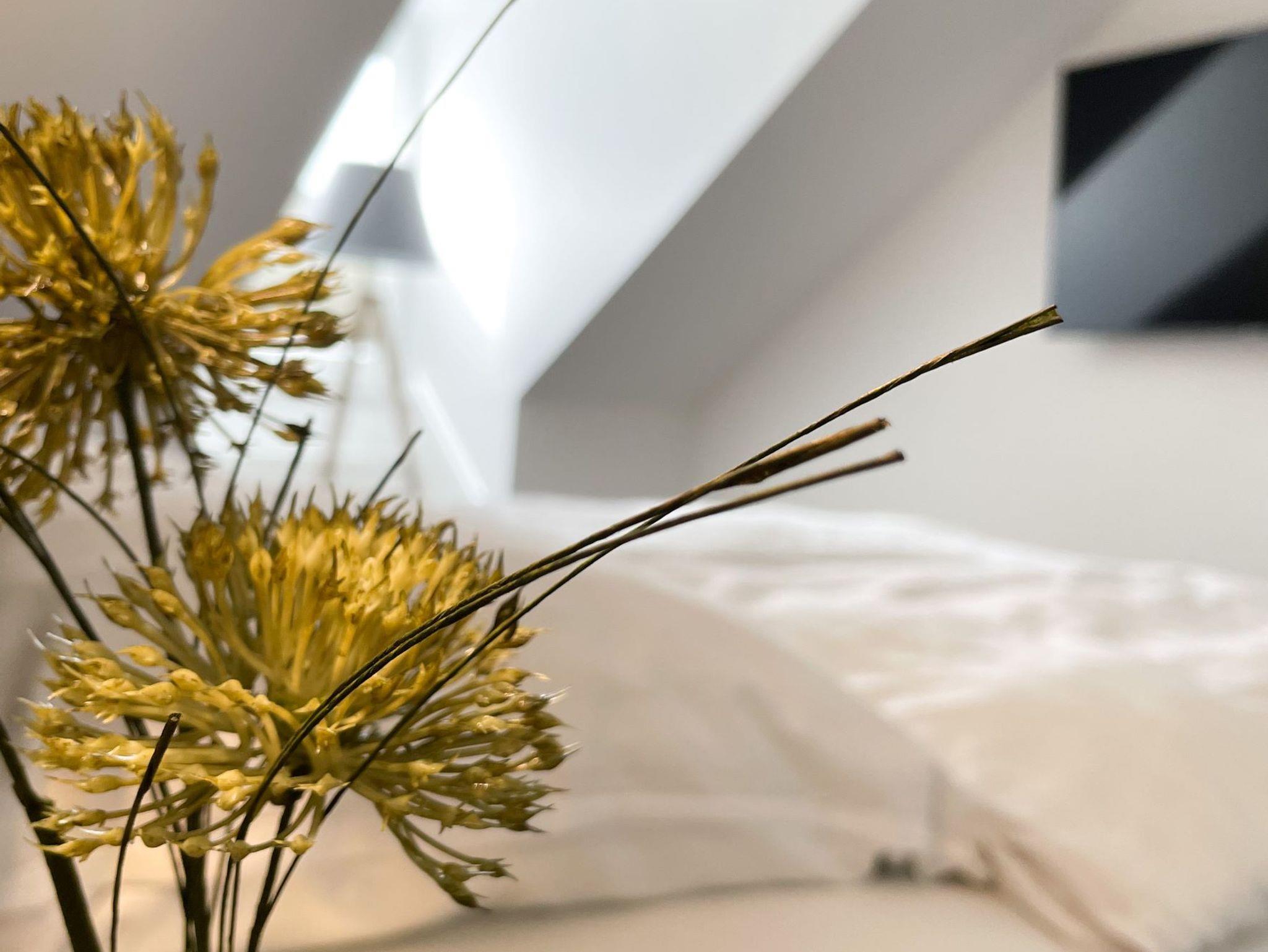 Im Wohnbereich sorgt während der kalten Jahreszeit ein Bio-Ethanol-Wandkamin für zusätzliche Gemütlichkeit. Das wunderschöne Echtholzparkett und der helle Arbeitsbereich mit Schreibtisch und Wlan machen den Raum komplett.