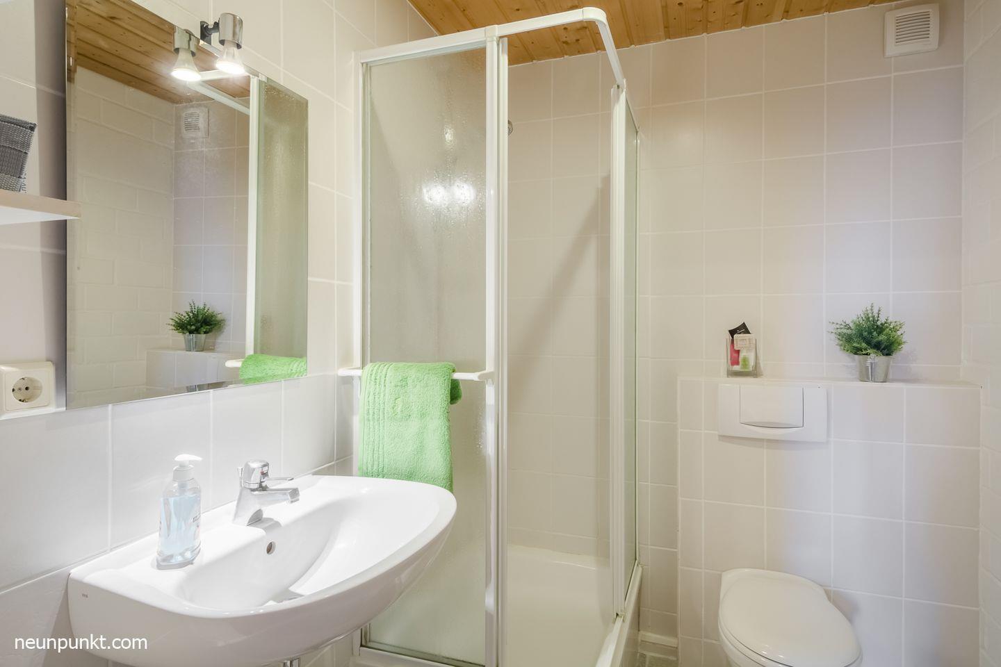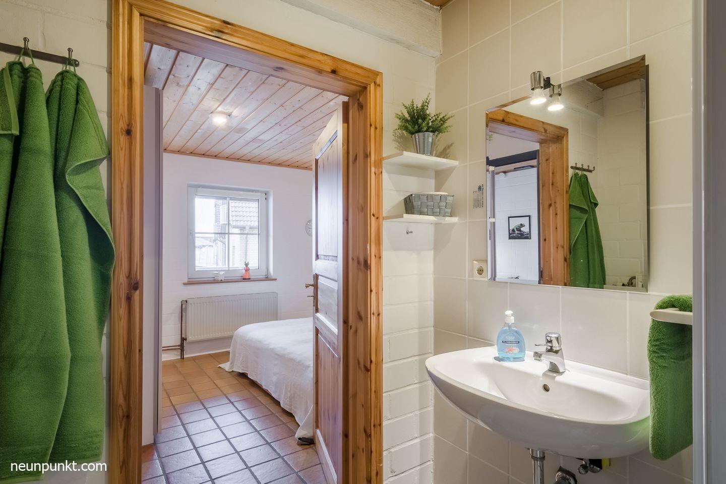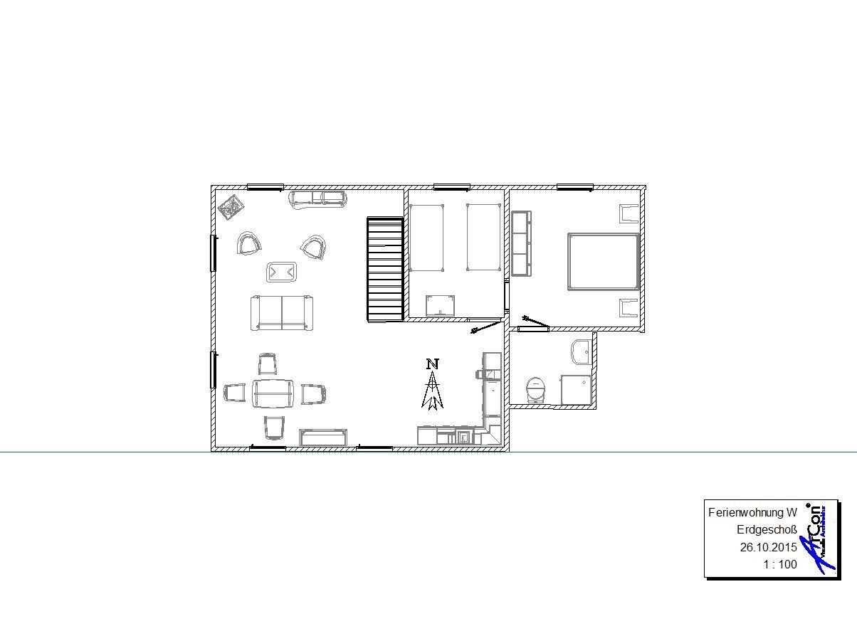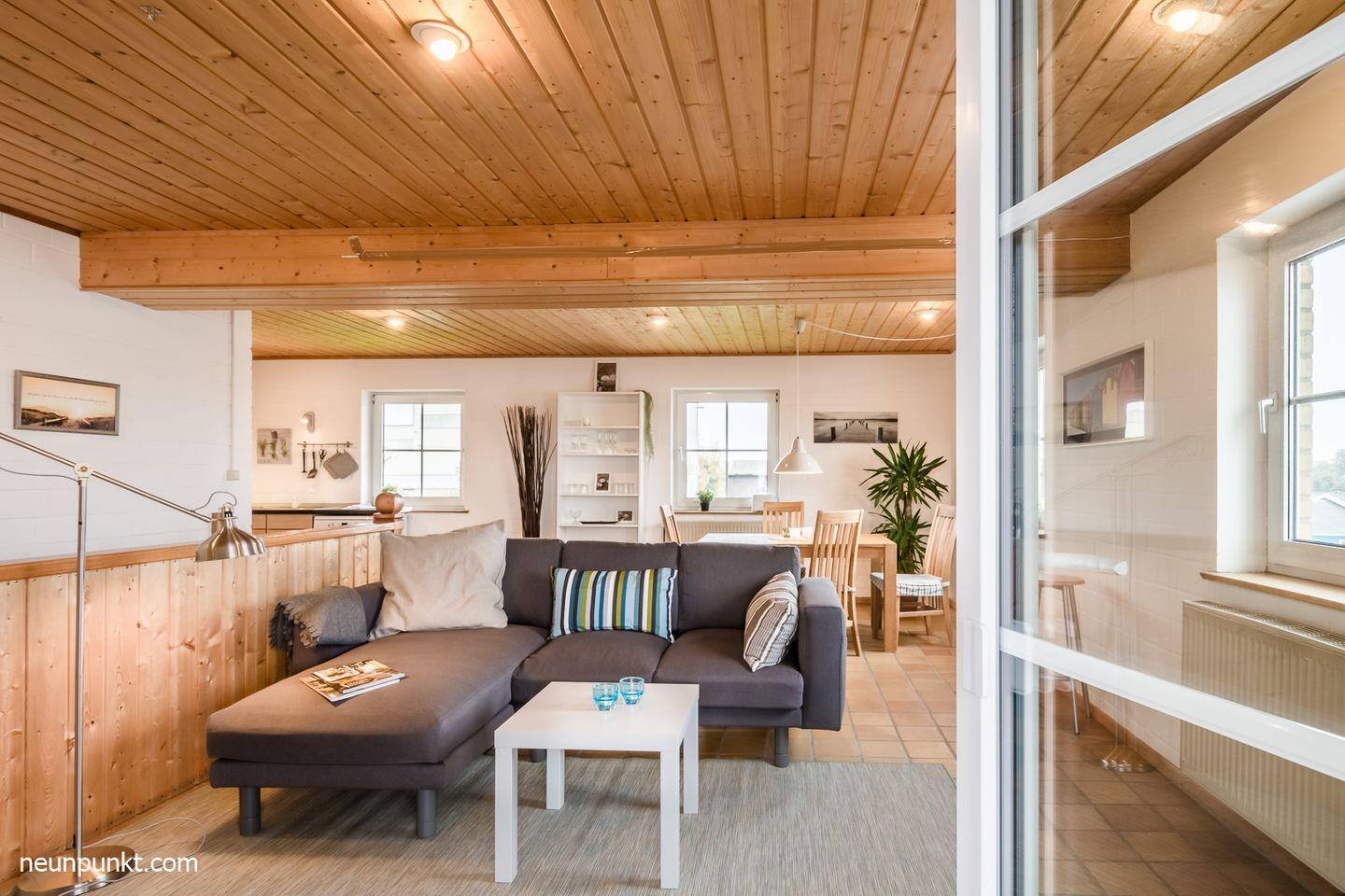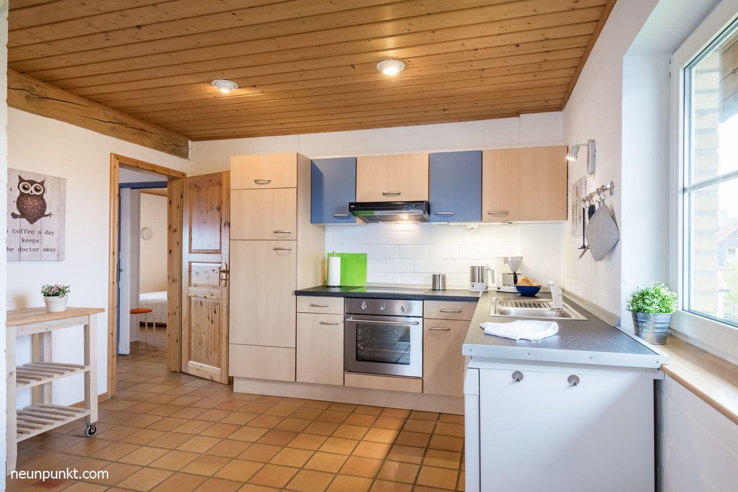 Die Ferienwohnung teilt sich auf in einen Wohnraum mit Kaminofen, einen Essplatz am Fenster, Küchenzeile mit Induktionskochfeld, Geschirrspüler (sehr leise Spülvorgänge), Kühl-/ Gefrierkombination, ein Schlafzimmer mit Doppelbett (2x 90x200cm), ein Durchgangszimmer mit einem Einzelbett (80x200cm) und einem Duschbad mit Dusche, WC und Fußbodenheizung.