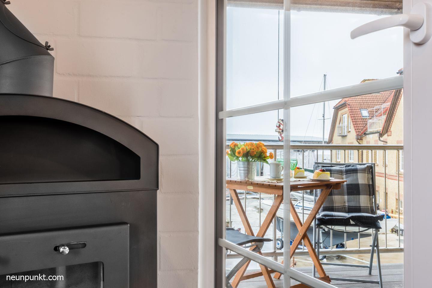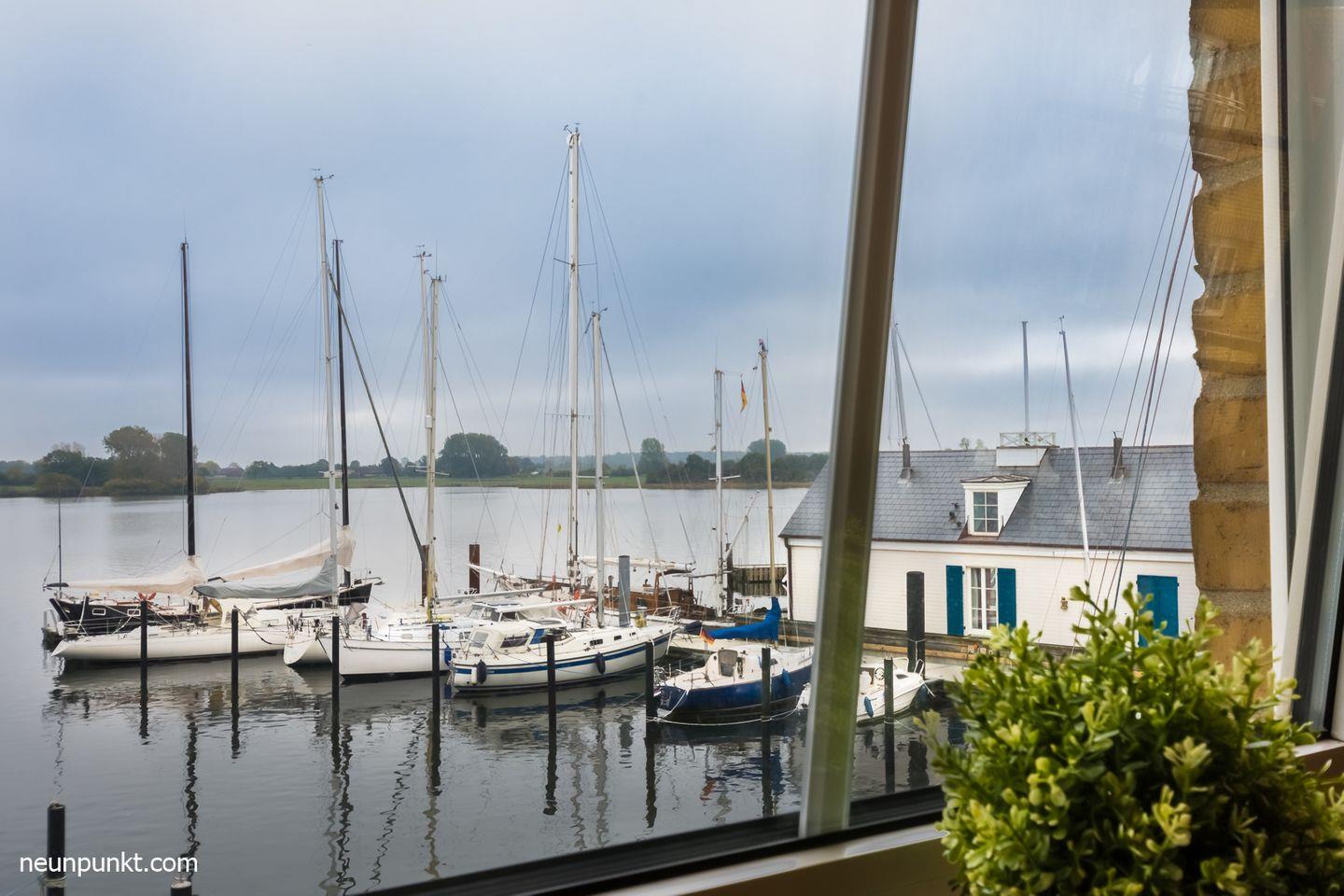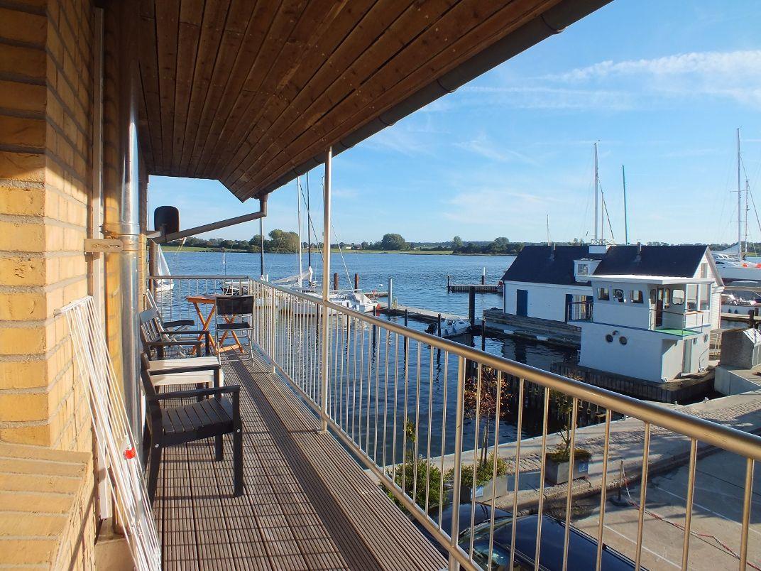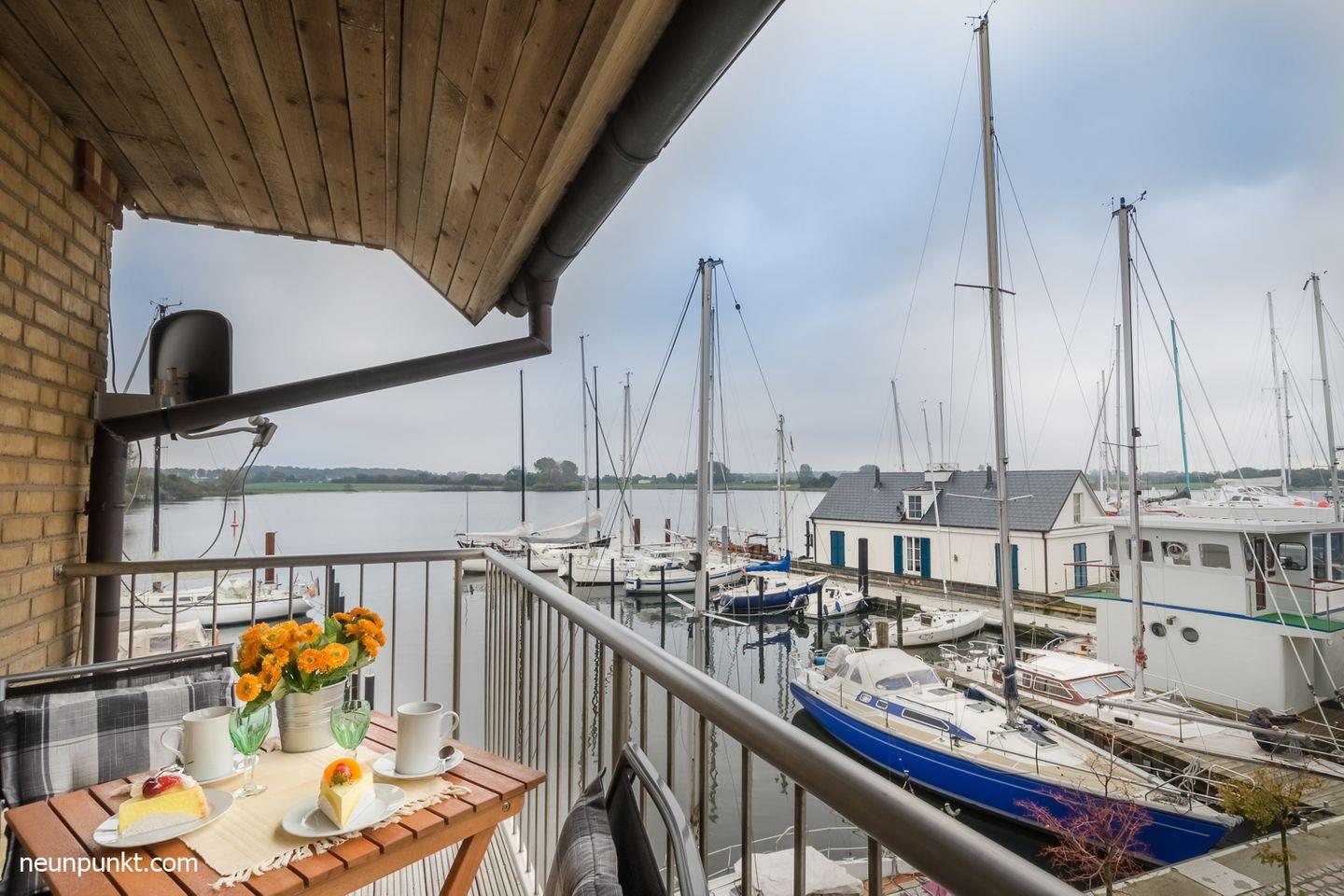 Entspannen können Sie auf dem überdachten Balkon mit Hafen- und Schleiblick.