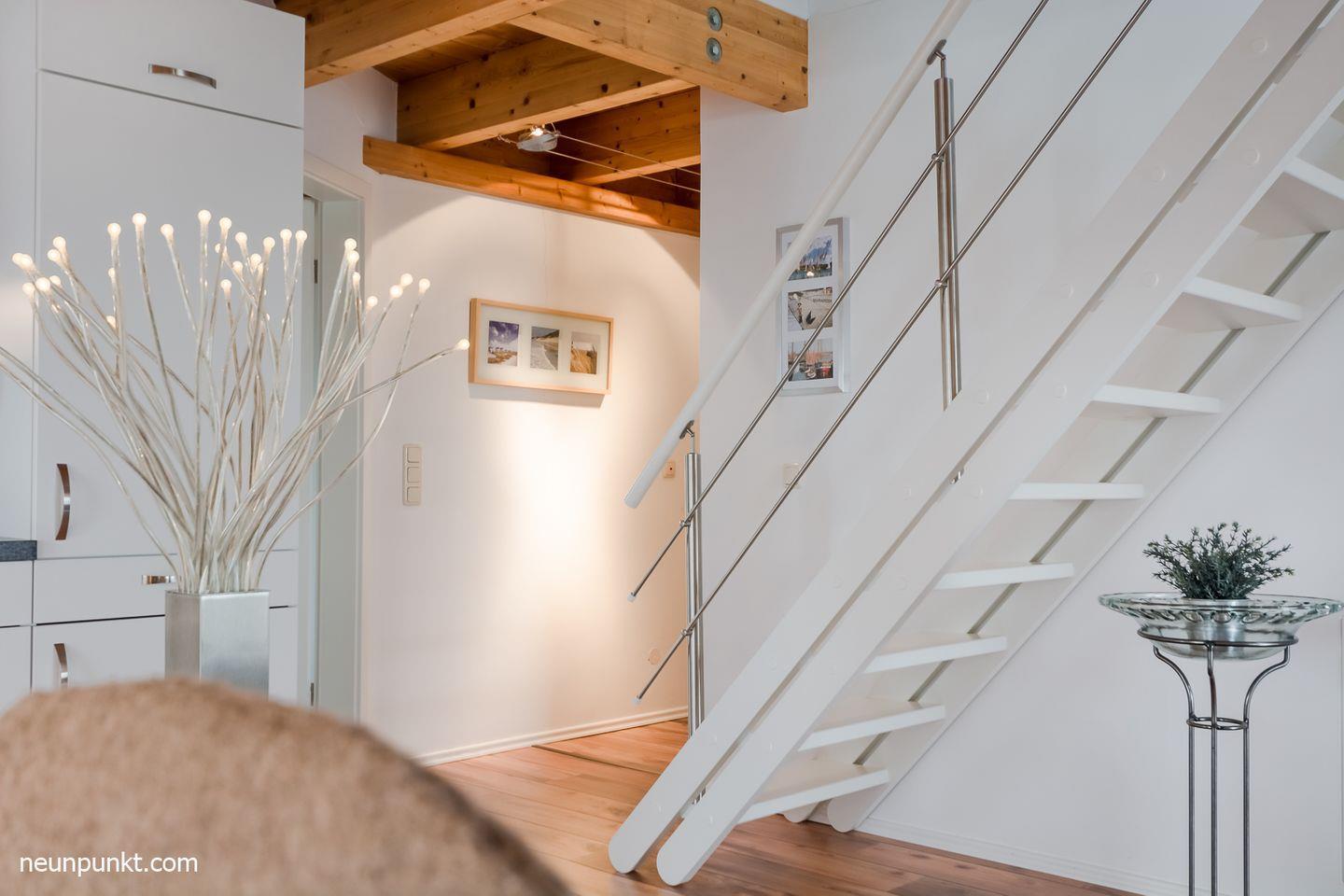 Im Obergeschoss gibt es ein geräumiges Badezimmer mit Dusche und WC. Ein zusätzliches Gäste-WC finden Sie im Dachgeschoss der Ferienwohnung.