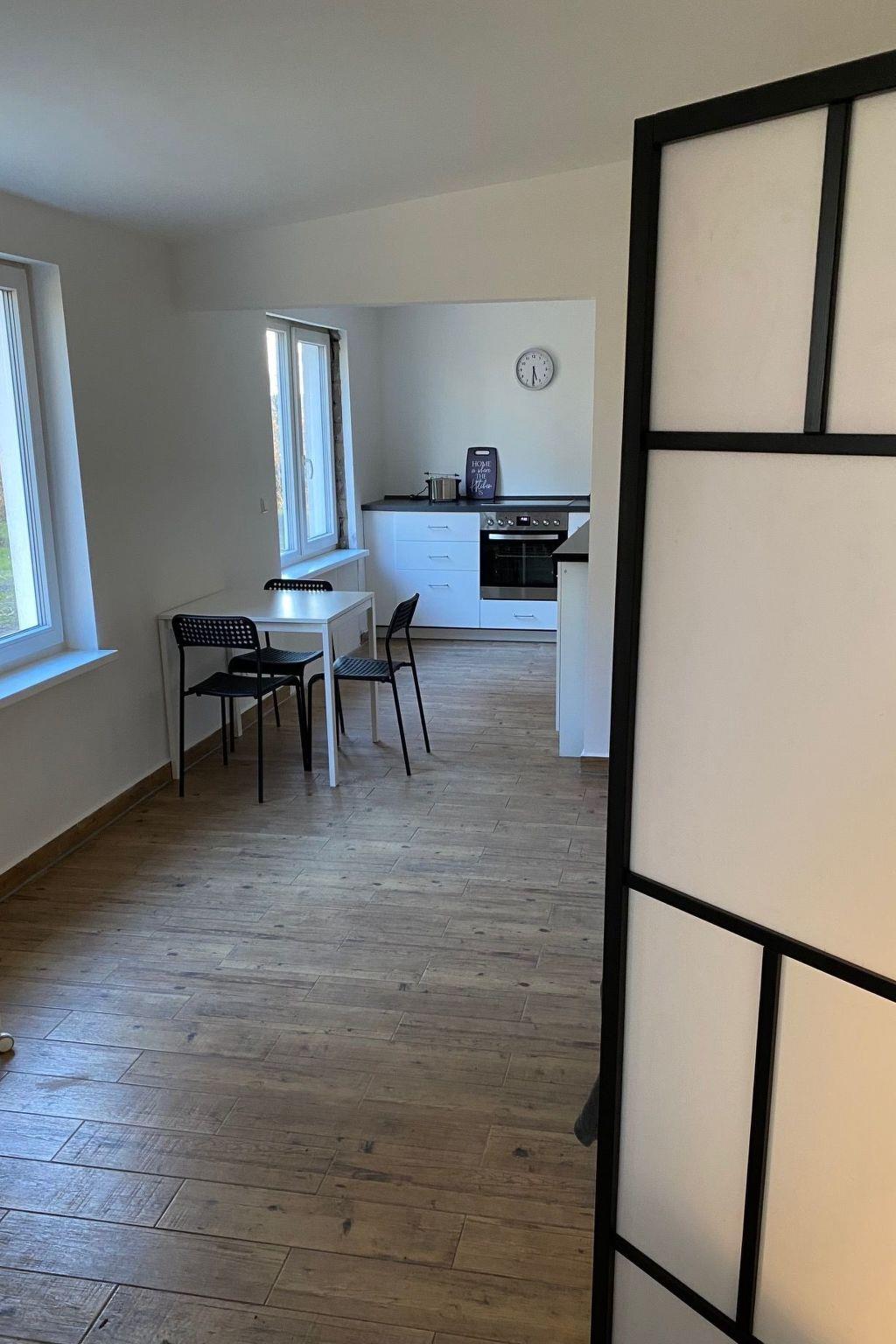 The garden flat is a modern apartment on the ground floor, 35 sqm, studio flat, open-plan living/sleeping area, open-plan kitchen area, rain shower, tiles, FB heating in an ensemble with 3 other holiday flats in a house in the countryside. Approx. 8,000 square metres of fenced-in outdoor area for your four-legged companions. Direct access from the house - no need to put them on a lead, just open the door and let the fun begin! This flat has its own small extra garden with terrace, direct exit from the kitchen. Breakfast in the sunshine on your own terrace - pure relaxation! Your dogs can roam freely in the garden and run.