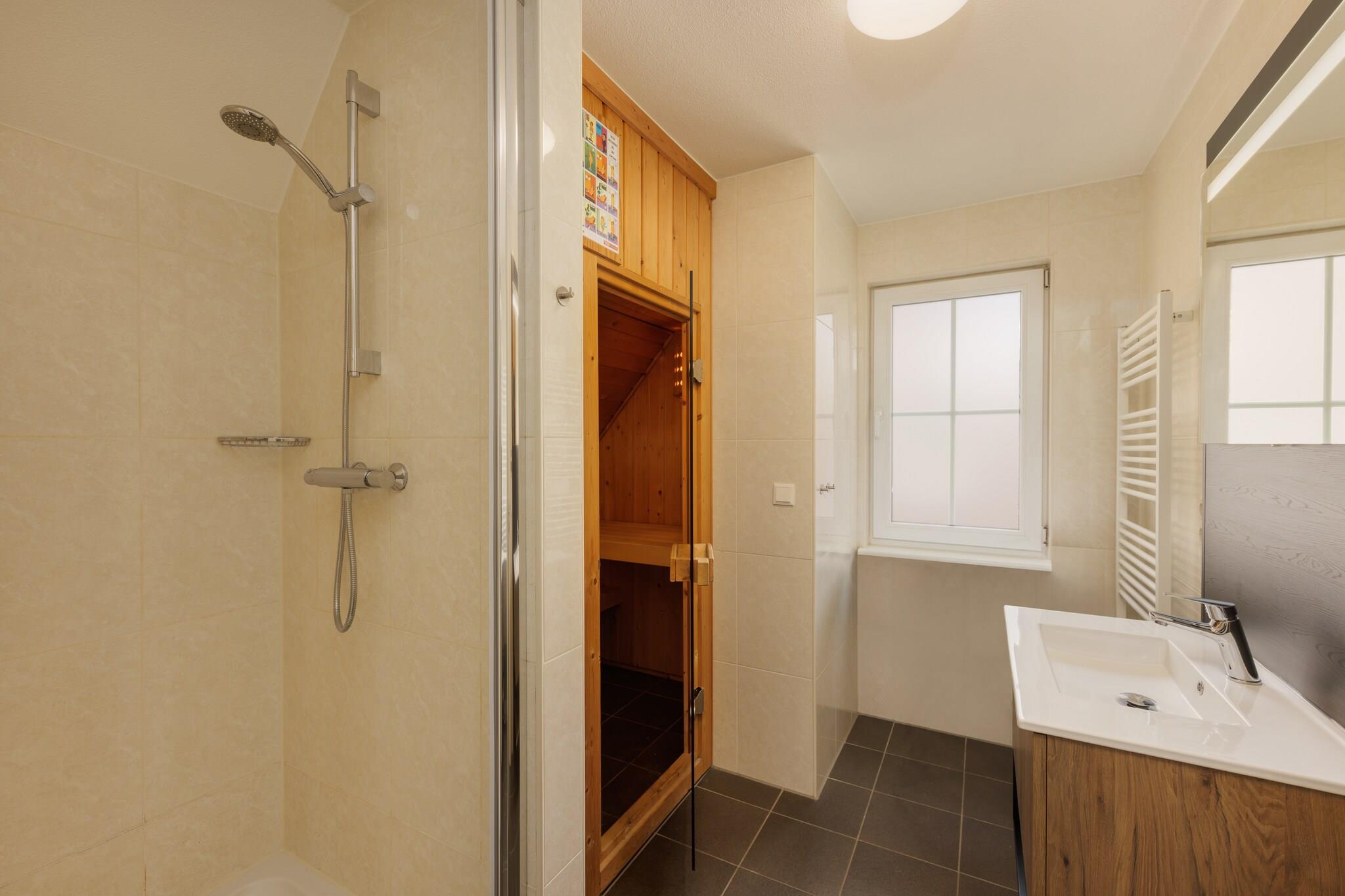 Stueetage: (entre(toilet), Stue(Fjernsyn, varme(gulvvarme)), Køkken(elkedel, kaffemaskine(kaffetragt, kaffepude), combi-mikroovn, opvaskemaskine , køle-fryseskab)) På 1. etage: (soveværelse(dobbeltseng eller 2 enkeltsenge Senge, Fjernsyn), soveværelse(enkeltseng, dobbeltseng eller 2 enkeltsenge Senge), badeværelse(badekar, håndvask), badeværelse(bruser(Walk-in-bruser), sauna, håndvask), Repos(toilet)) pulterkammer(tørretumbler, vaskemaskine), terrasse, have, havemøbler, parkering, liggestole