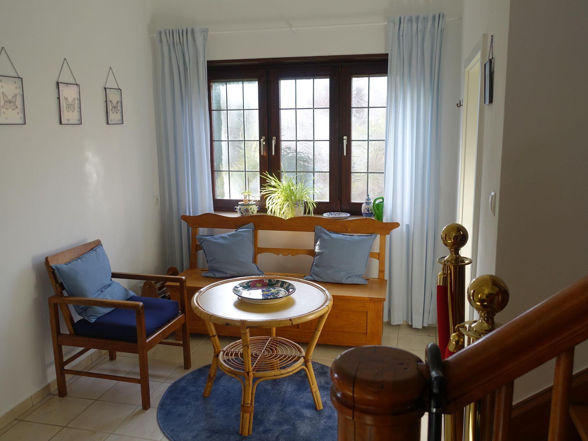 Die Ferienwohnung (ca. 55 m²) ist komplett ausgestattet, sie verfügt über eine vollständig eingerichtete Küche (Spülmaschine, Mikro-Welle … ), Wohnzimmer mit Klappsofa, Schlafzimmer mit Doppelbett, Wintergarten sowie einem modernen Bad mit begehbarer Dusche. WLAN und TV ( mit fire stick über WLAN verbunden) sind selbstverständlich auch vorhanden. Bettwäsche sowie Hand- und Duschtücher stehen zur Verfügung. Ein eigener Stellplatz für Ihr Fahrzeug befindet sich neben dem Haus, Fahrräder können bei Bedarf in der abschließbaren Garage oder im Unterbau hinter dem Haus abgestellt werden.