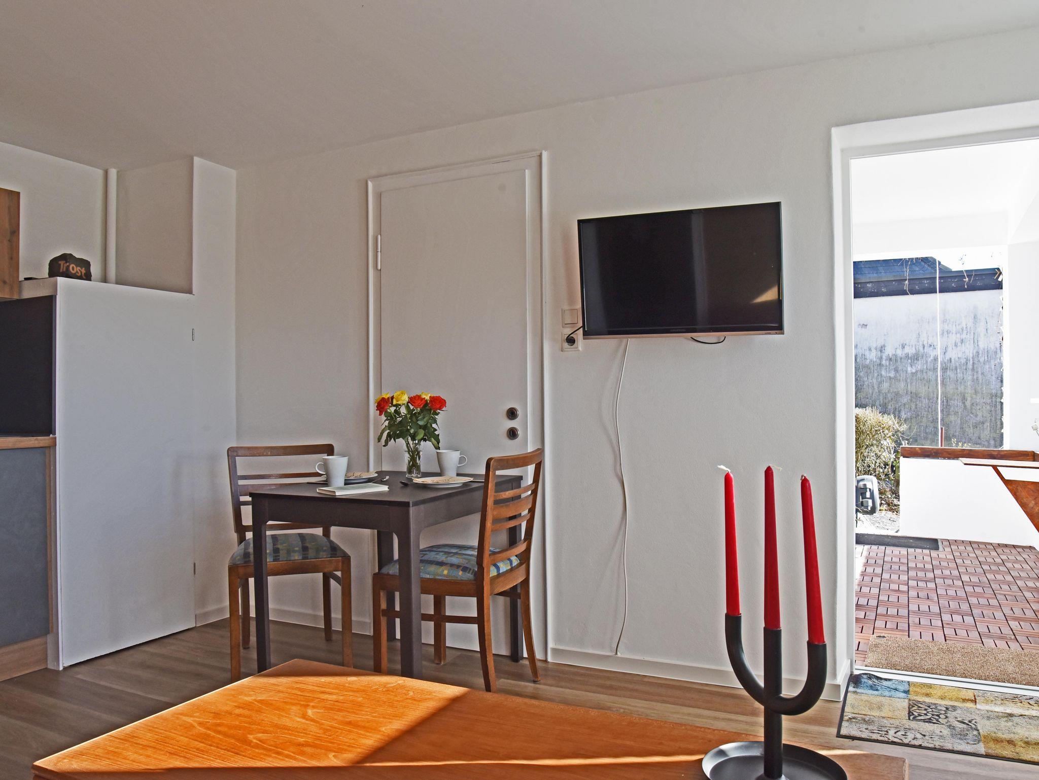 Die Wohnung bietet zwei gemütliche Zimmer mit Küchenzeile, ein kleines Bad mit Dusche sowie einen überdachten Balkon mit Zugang zum Garten. Kleine Annehmlichkeiten lassen den Aufenthalt zum Genuss werden: im Bad bringt ein beheizbarer Spiegel auch nach dem Duschen ein klares Bild. Im Schlafzimmer sorgt ein zusätzlicher Verdunkelungsvorhang für einen ruhigen Schlaf bis in den Tag hinein. Auf Wunsch gibt es ein Zustellbett für ein kleines Kind. Die Küchenzeile bietet mit Induktionskochfeld, höher gelegtem Backofen, zusätzlicher Mikrowelle und einer Kühl- Gefrierkombi für angenehmen Komfort. Und vom gemütlichen Sofa aus lässt sich das Smart-TV für die unterschiedlichsten Medien nutzen. Die teilweise offen mit Lehm verputzen Wände sorgen für eine gemütliche Atmosphäre und ein sehr gutes Raumklima. E-Bikes finden einen sicheren Raum und für das Auto gibt es einen trockenen Platz im Carport.