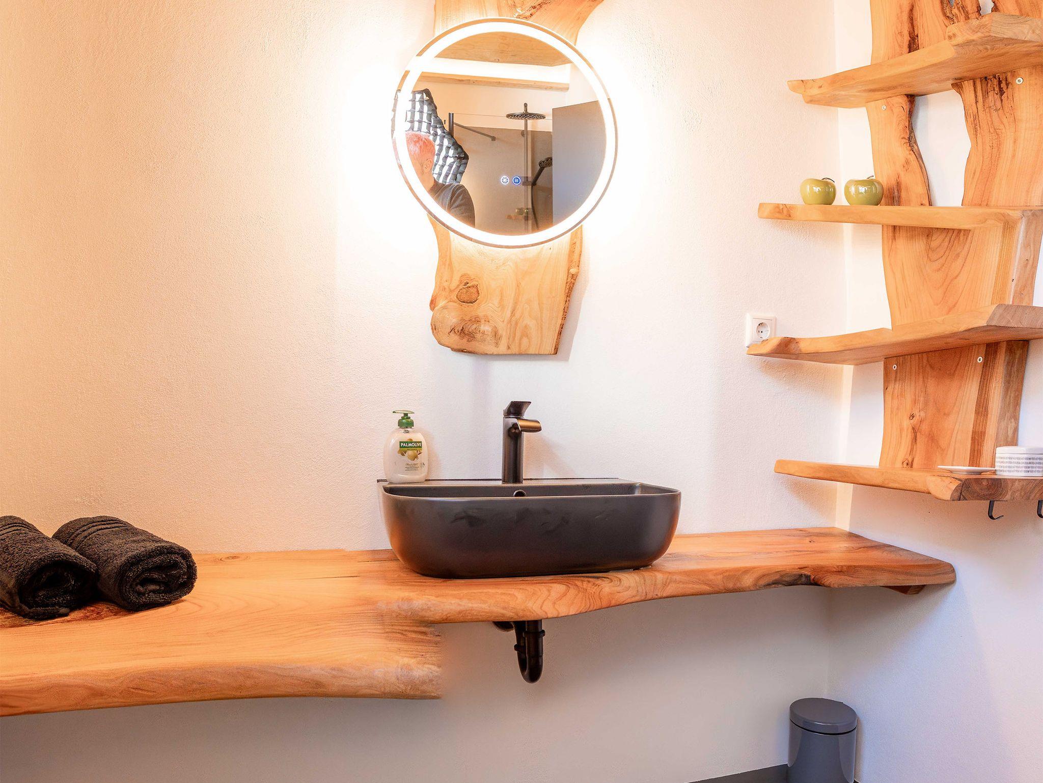 Das stilvolle Schlafzimmer ist mit einem komfortablen Doppelbett und einem geräumigen Kleiderschrank ausgestattet. Auf Wunsch stellen wir Ihnen gerne ein Babybett und einen Hochstuhl zur Verfügung. Direkt gegenüber befindet sich das einladende Duschbad – ideal für einen frischen Start in den Tag.