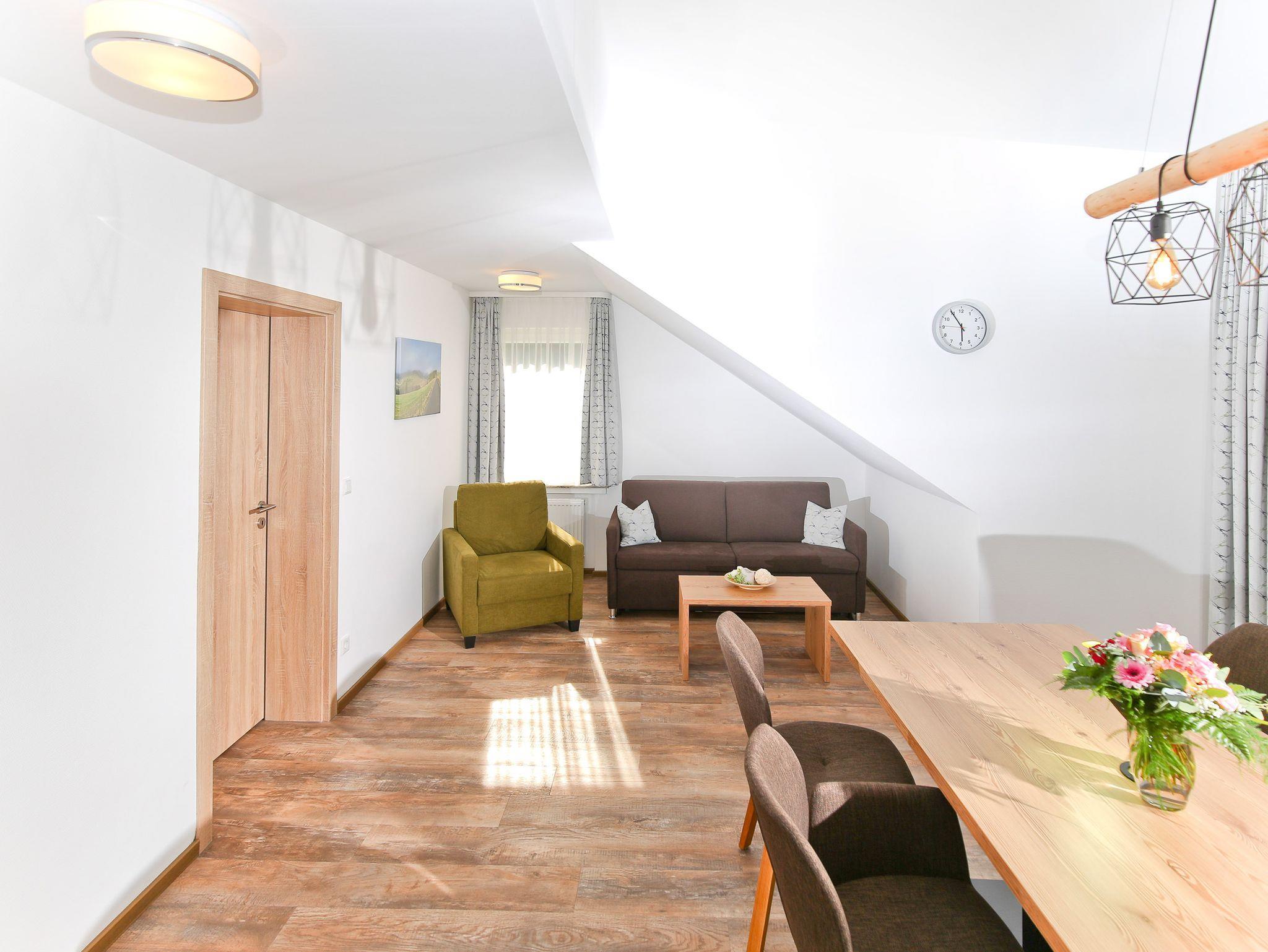 Der geräumige Wohn- und Essbereich ist wie geschaffen für spaßige Brett- und Kartenspielrunden und ist durch die Kombination aus Holzoptik und Moderne der Hingucker schlechthin in der Ferienwohnung. Auch die interessante Dachschräge verleiht dem Raum einen besonderen Charme.