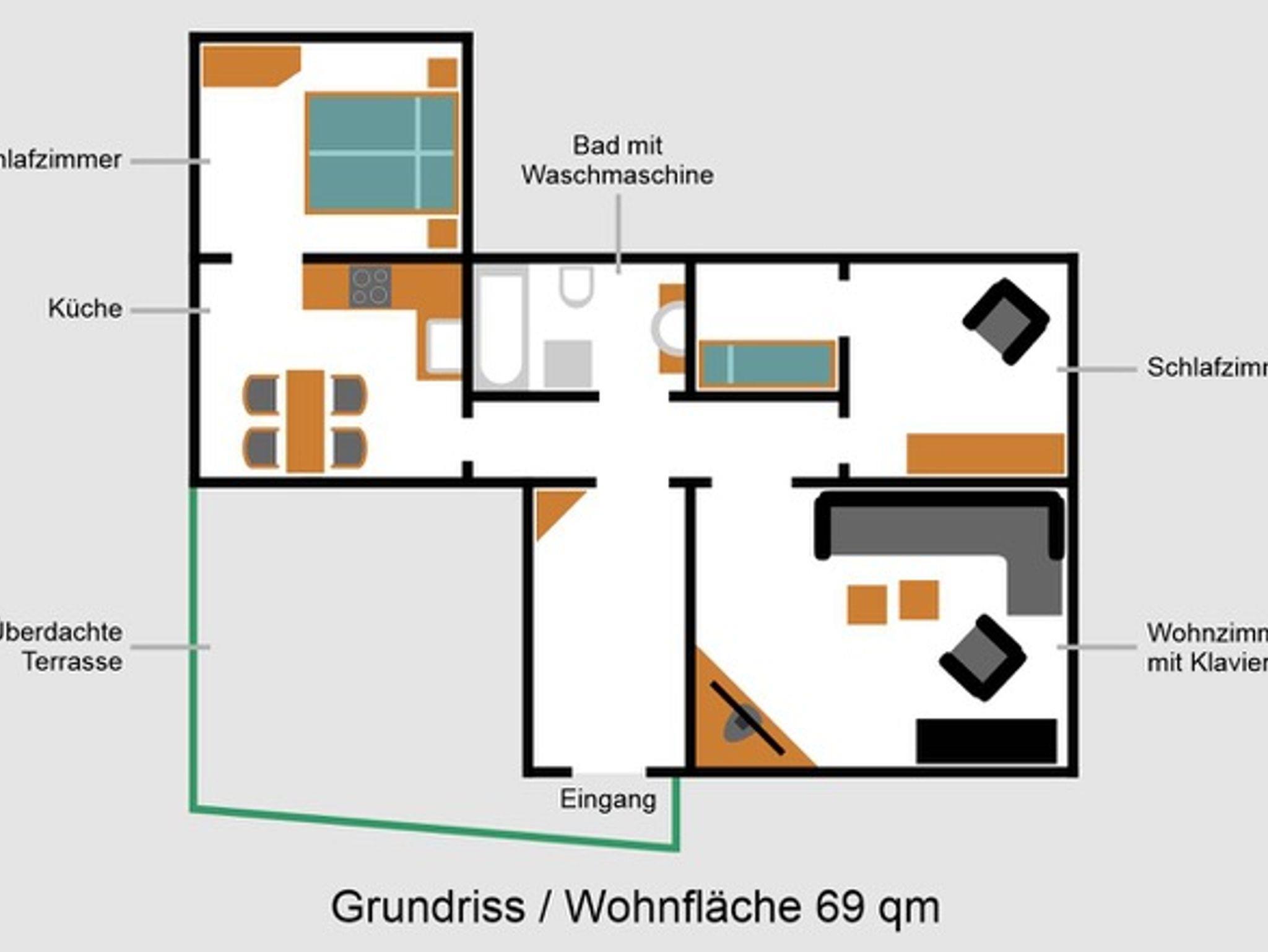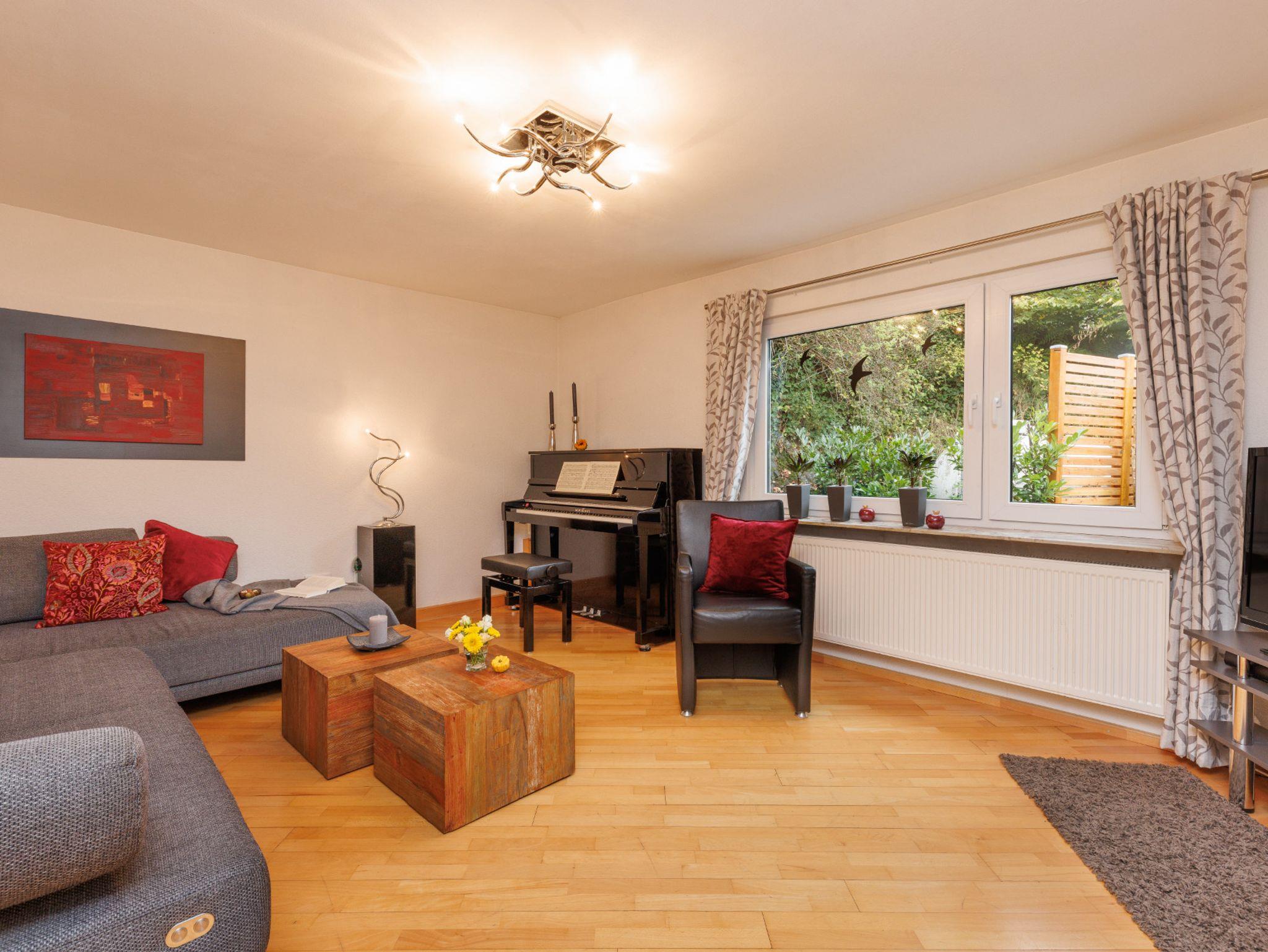 Im Wohnzimmer befindet sich eine Eckgarnitur, Sessel, ein SCHIMMEL-Piano (gebaut 2011 in Braunschweig), SAT-TV und W-LAN.