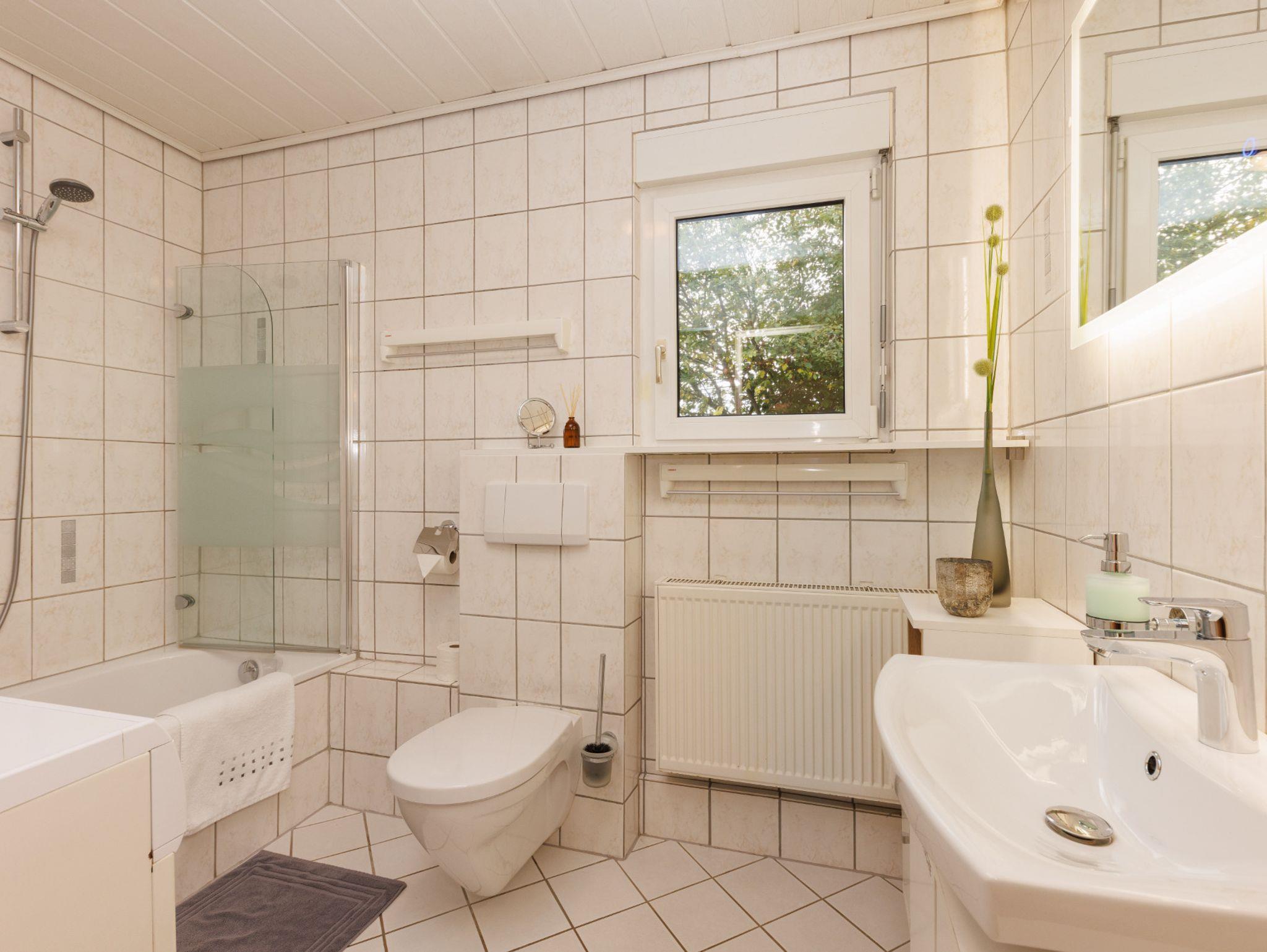 Das Badezimmer ist Komplett eingerichtet mit Badewanne, Dusche in der Badewanne, Toilette, Waschbecken, Waschmaschine,