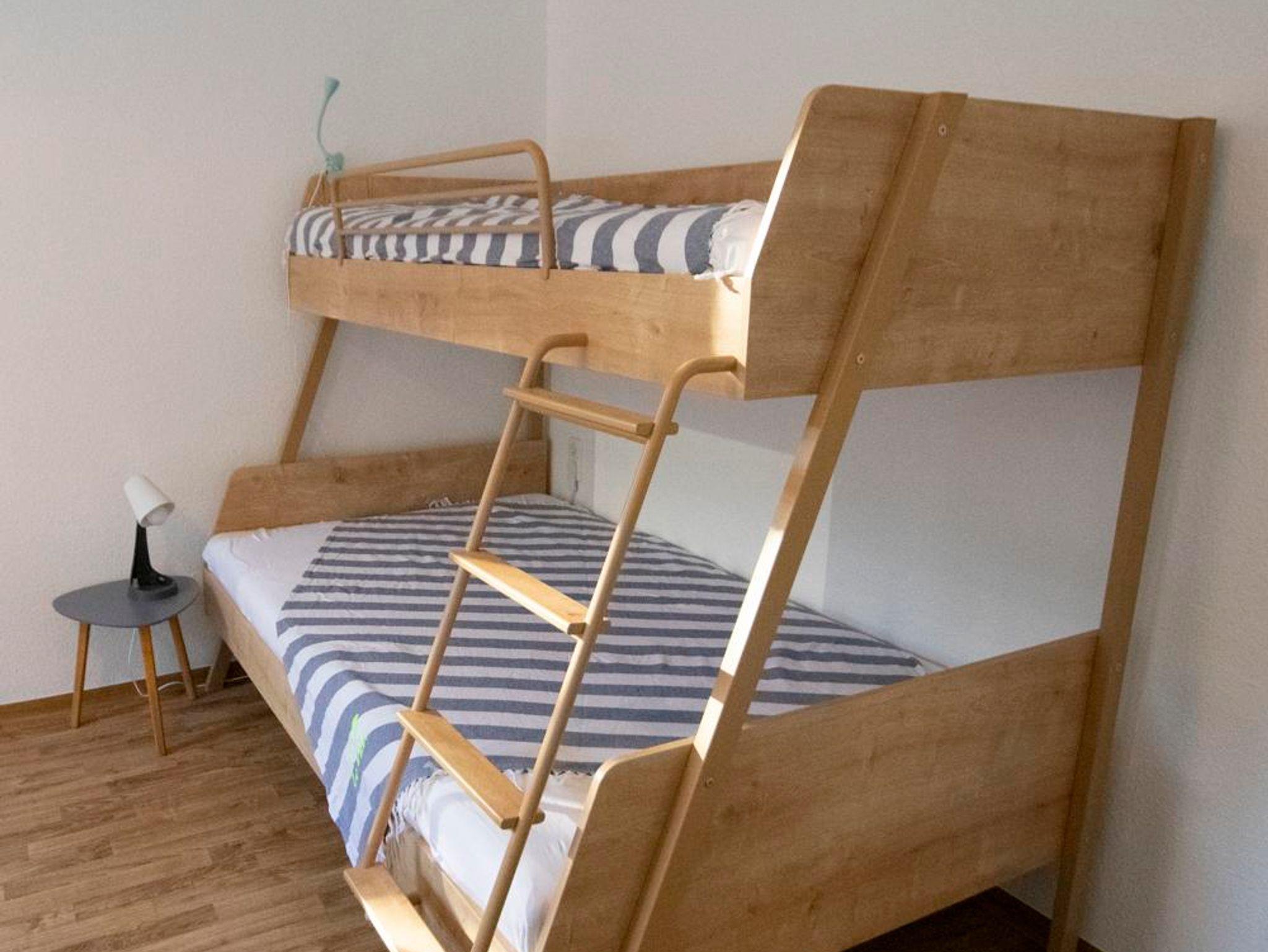Schlafzimmer Meduna: Sichtschutz-Plissees und Verdunkelungsvorhang, Doppelbett (180×200) und Doppelstockbett (120×200 Unterbett/ 90×200 Oberbett), Kleiderschrank mit integriertem Spiegel, Nachttische und Beleuchtung, Schlafraum Richtung Clara-Viebig-Straße und Klinikpark,
