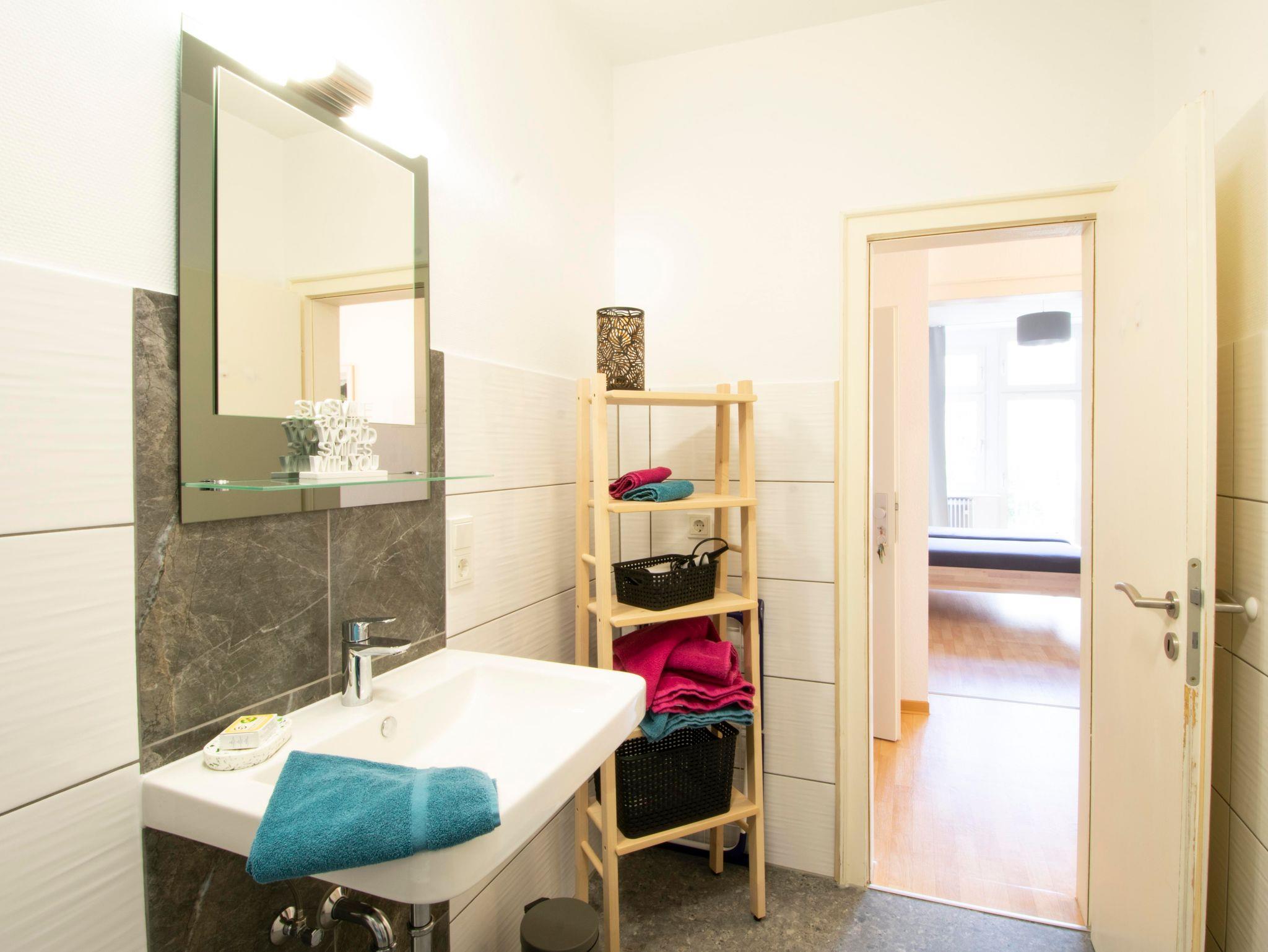 Badezimmer: helles und geräumiges Badezimmer mit großem Fenster zum Hof gelegen, gemauerter Dusche mit Glasduschtür, Vorwand-WC, Waschmaschiene und Wäscheständer