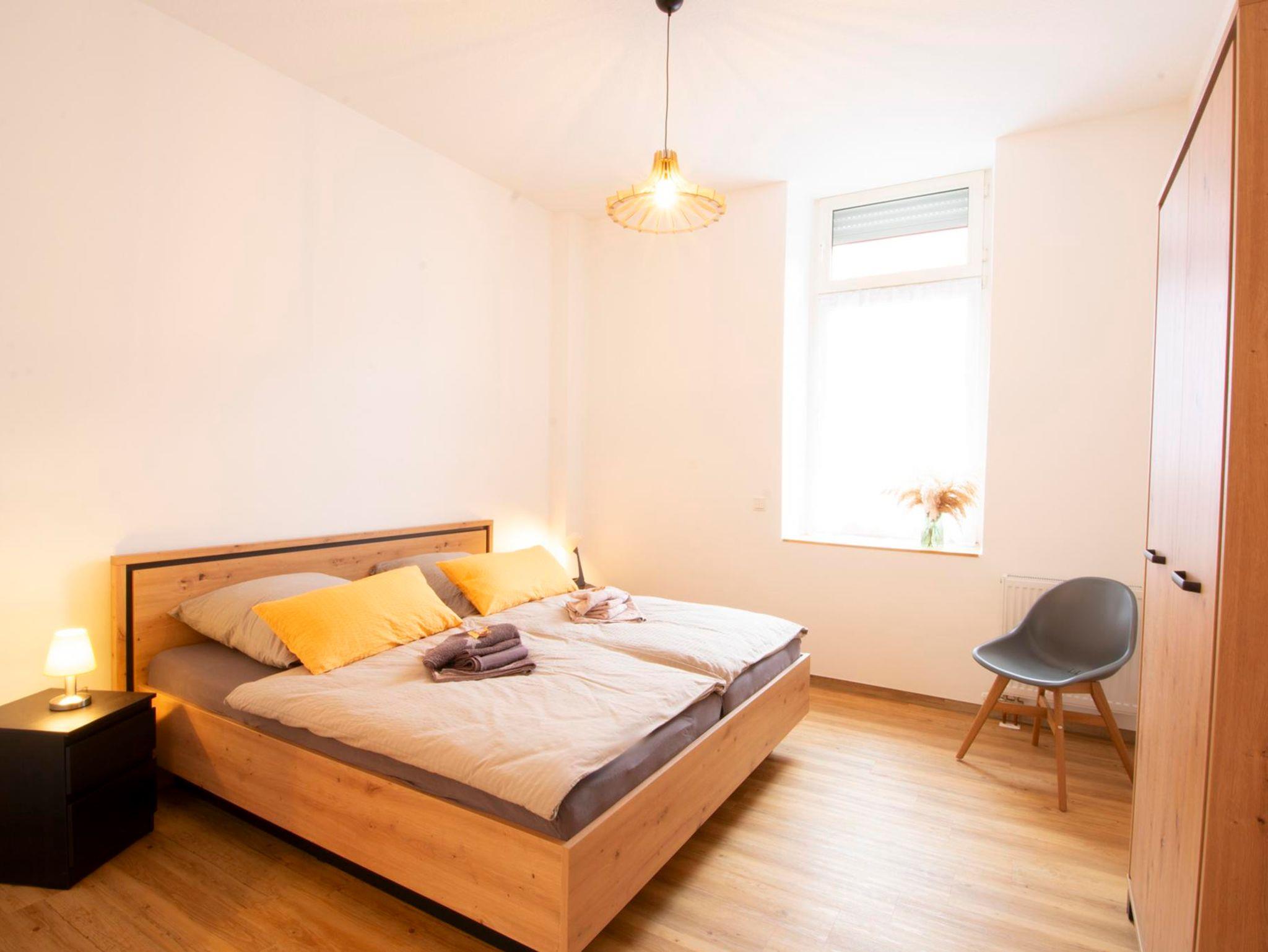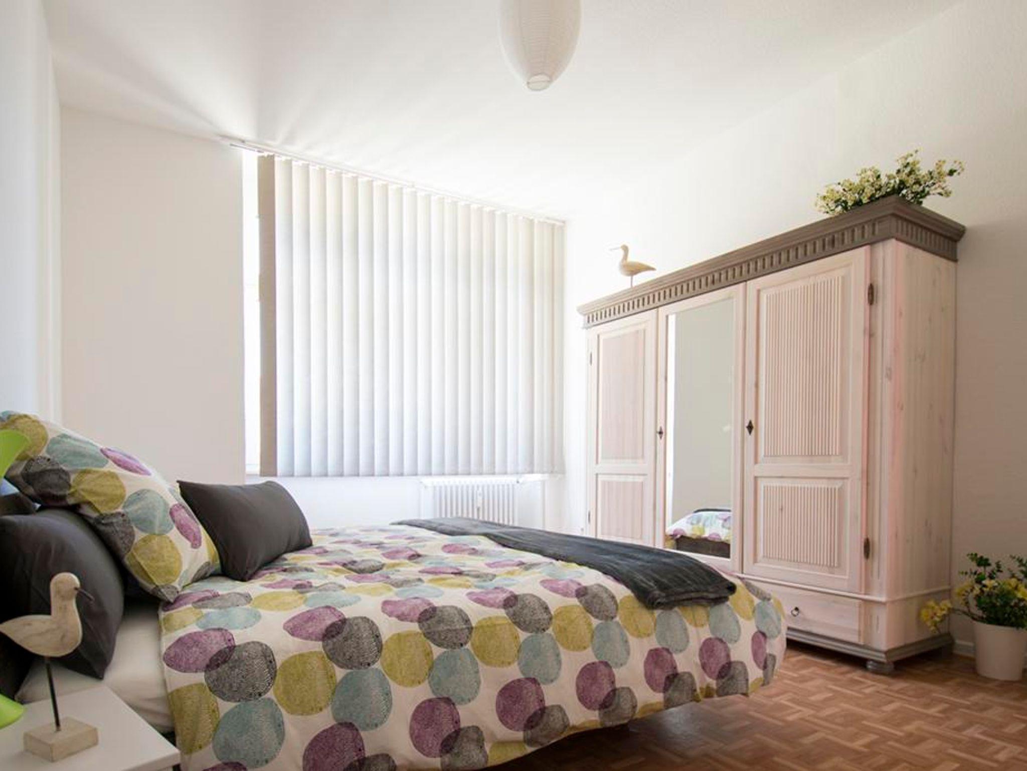 Schlafzimmer Clara-Viebig-Straße: großzügiger und heller Schlafraum mit 2-Türer-Kleiderschrank und 180×200 Doppelbett, Nachtischschränkchen und Beleuchtung, verdunkelbar durch Jalousie, Ausblick Richtung Therme und Hofeinfahrt/Straße