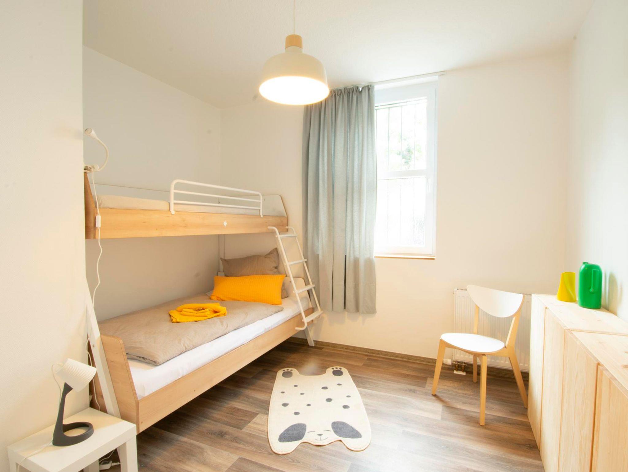 Schlafzimmer Hof / Kinderzimmer: Zimmer zum Hof gelegen, mit Etagenbett 120x200 und 90x200 Liegefläche, Sidebord-Kommode, Garderobenhaken, Spielgelegenheiten, Beleuchtung