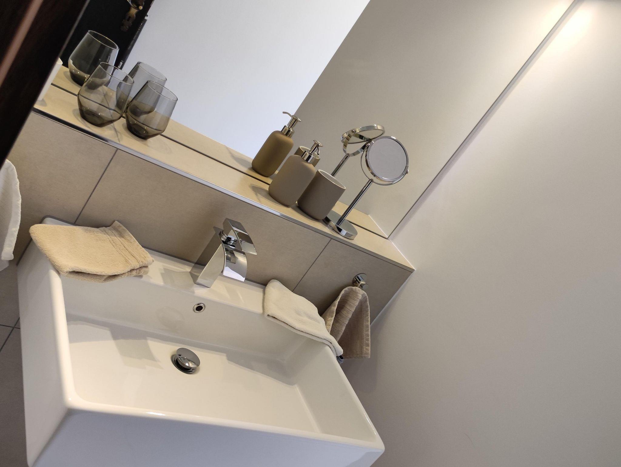 • Badezimmer mit Dusche, WC, Waschbecken, Haarfön, Kosmetikspiegel und Seife