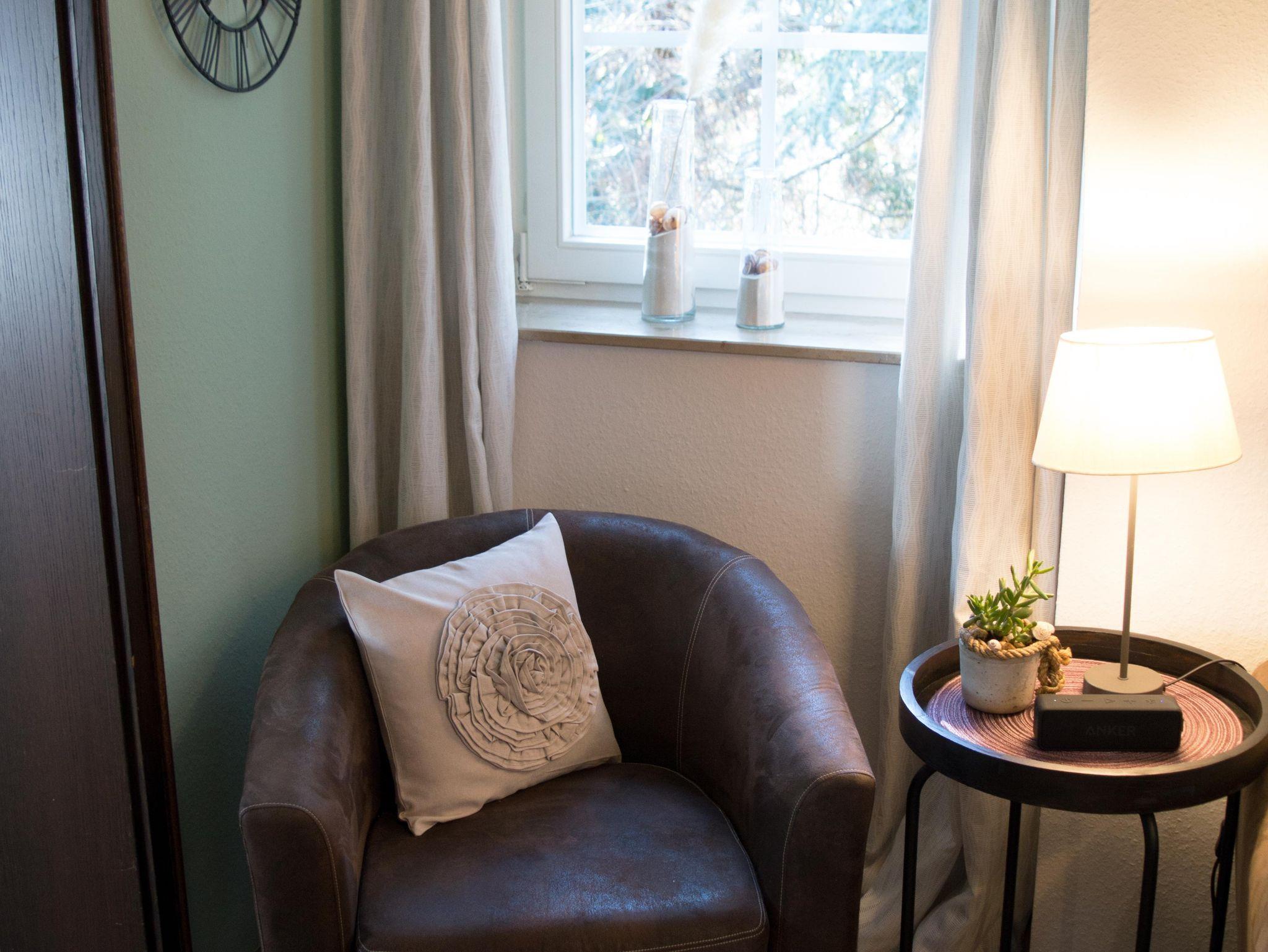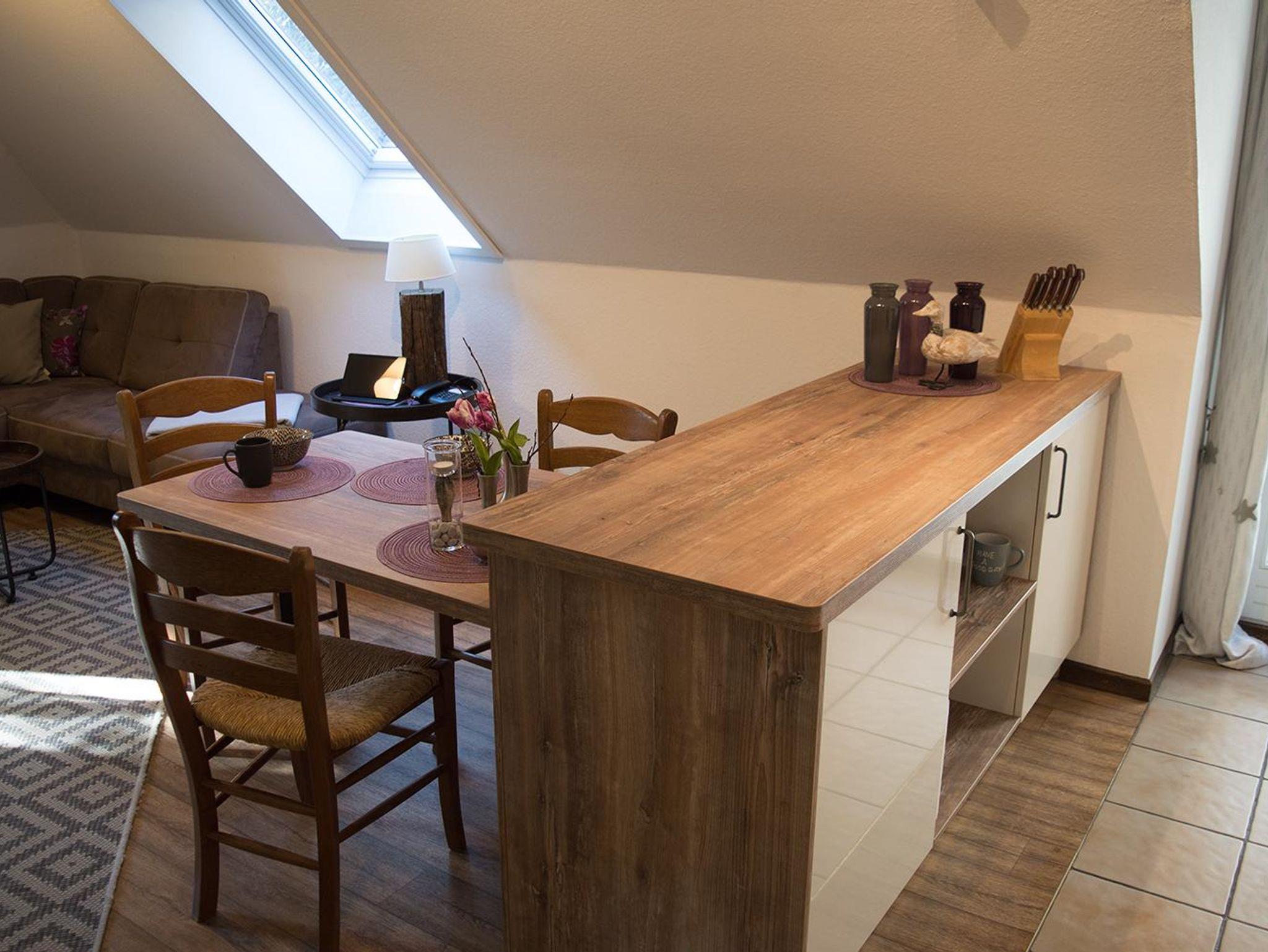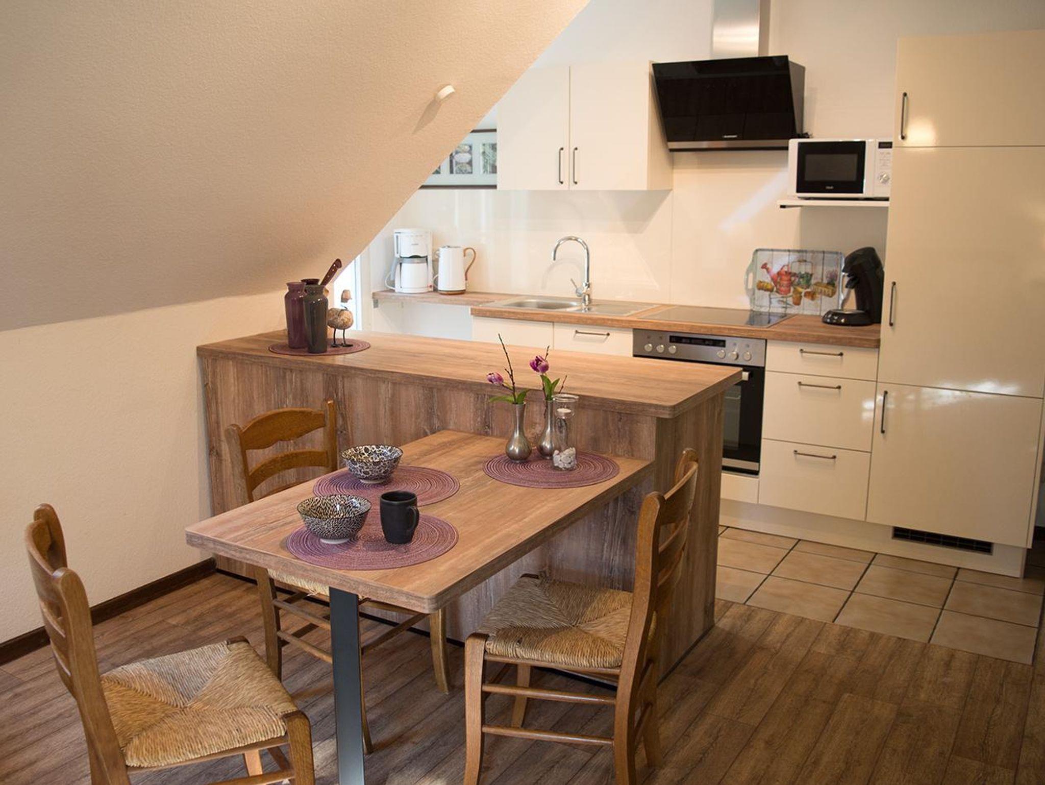 • Küchenzeile mit Herd, Abzugshaube, Backofen, Kühlschrank, Mikrowelle, Kaffeemaschine, Senseo-Kaffeepadmaschine, Toaster, Wasserkocher und allen gängigen Küchenutensilien