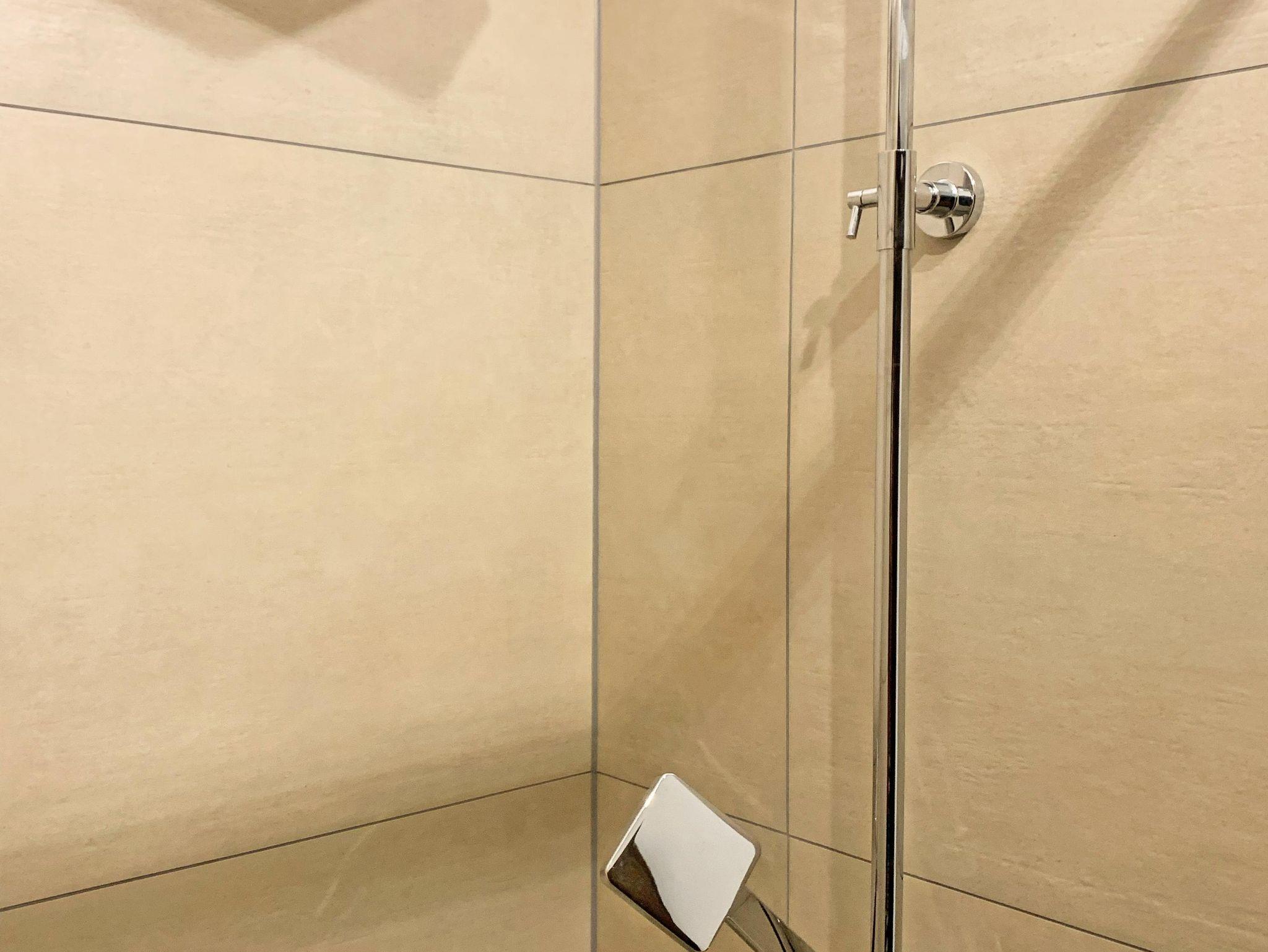 • Badezimmer mit Dusche, WC, Waschbecken, Haarfön, Kosmetikspiegel und Seife