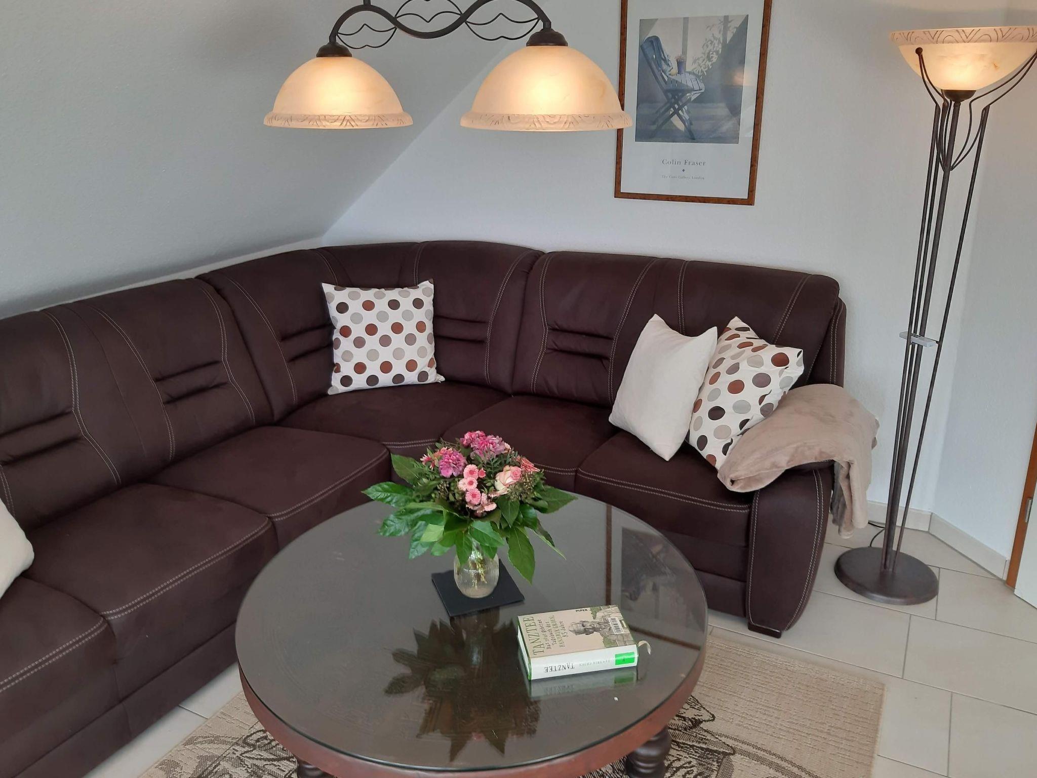 From there you enter the bathroom on the left and then directly into the living room with many other pieces of furniture to make your stay pleasant and comfortable. This includes the 52" flatscreen TV with amazon prime. From there, you can also access the spacious, covered balcony (125 x 540 cm) facing east and the Eckermannwiese with comfortable garden furniture.