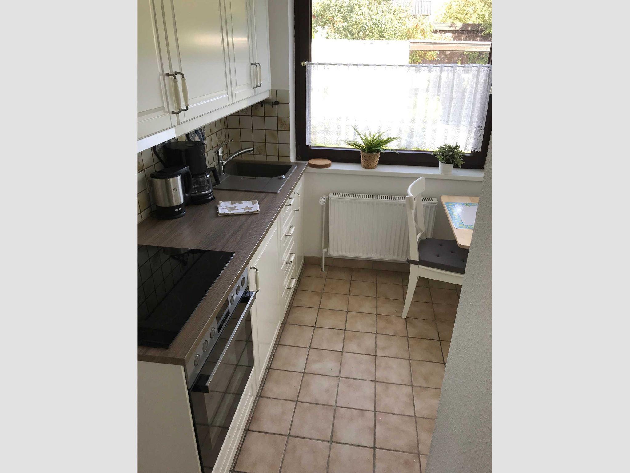 • 1 vollausgestattete Küche mit Herd, Backofen, Kühlschrank, Spüle und kleinem Essplatz,