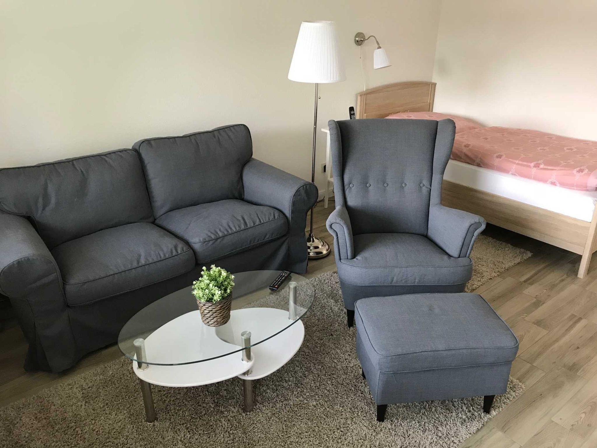 • 1 kombinierter Wohn-Schlafraum mit Einzelbett, Sofa, Sessel mit Beistelltisch und Zutritt zum Balkon,