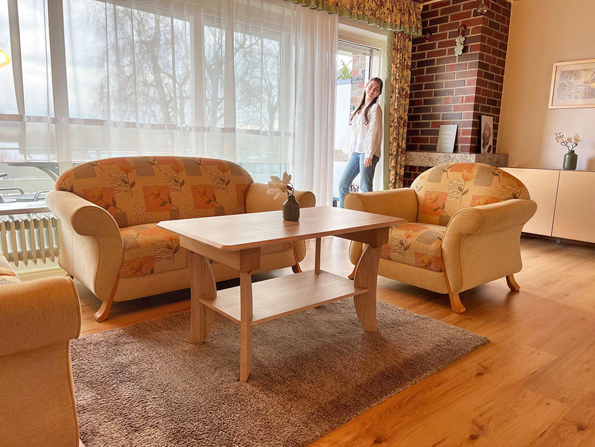 Die Einbauküche ist ausgestattet mit allen erforderlichen Küchenutensilien, Kühlschrank mit Gefrierfach, vier Herdplatten, Backofen, Kaffeemaschine, Wasserkocher, Toaster, Mikrowelle und Eierkocher, Geschirrtücher, Geschirrspülmaschine sowie eine gemütlicher Sitzgruppe