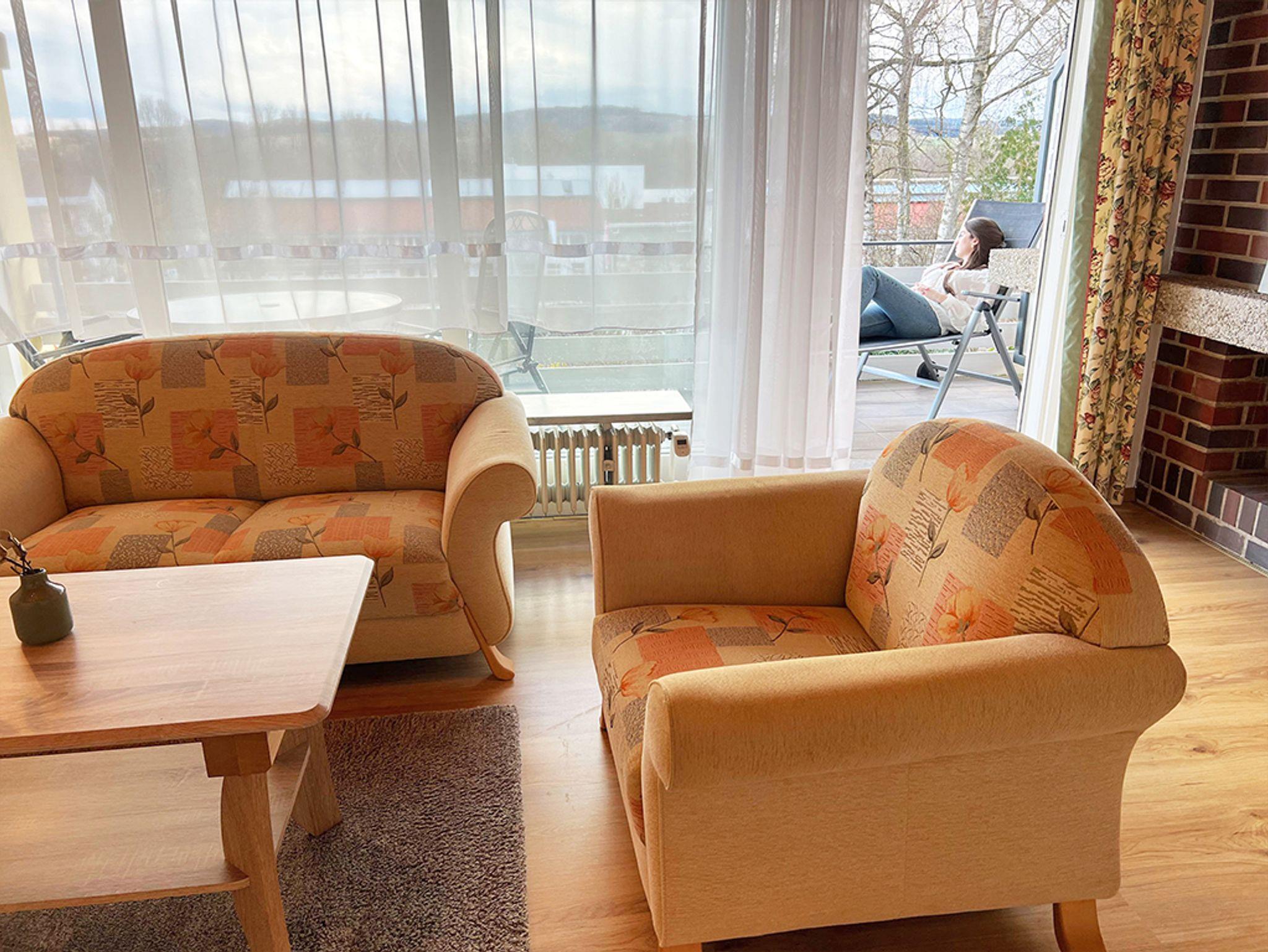 Parterre-Wohnung, großes helles Wohnzimmer (Panoramafenster/große Balkontüre) Zwei- und Dreisitzercouch, Sat-TV