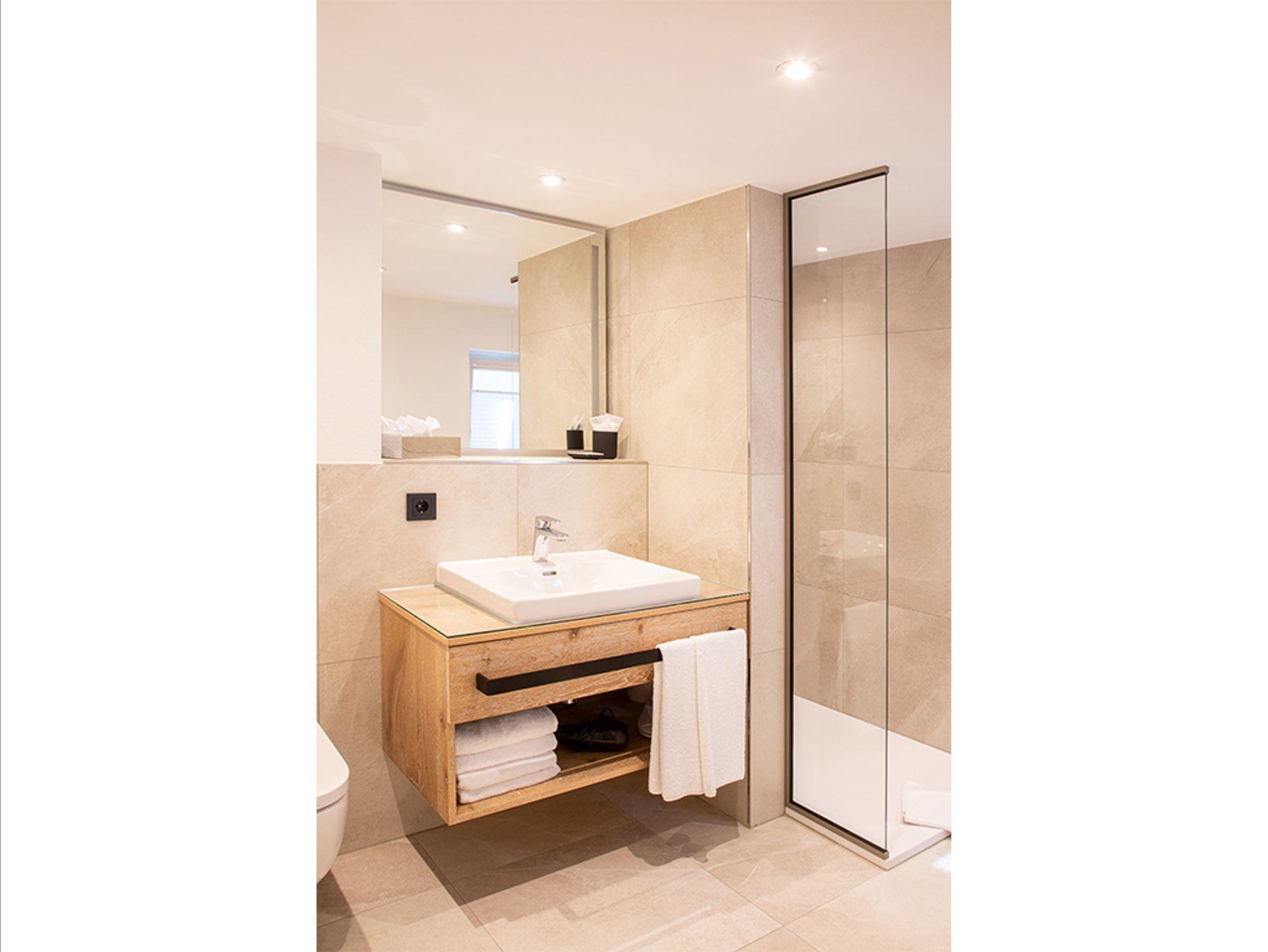 Gemütliche Holzvertäfelung kombiniert mit modernen Einbaumöbeln in warmen Holztönen, vereinen Tradition und Design. Die ebenso in höchster Handwerkskunst gefertigten Boxspringbetten der Fa. Treca Paris versprechen erholsamen Schlaf und Energie für Ihre Urlaubsaktivitäten rund um das ländliche Bad.