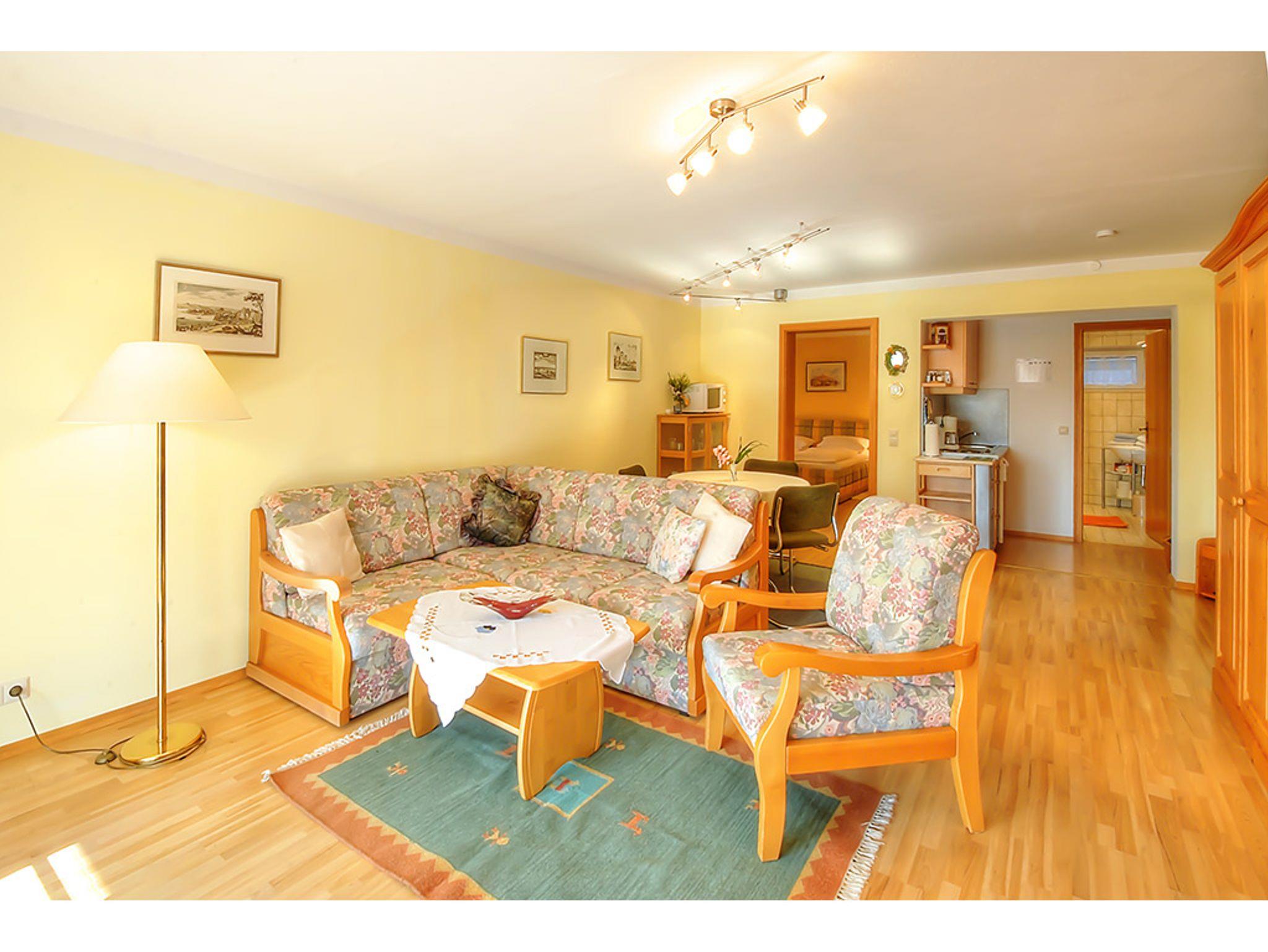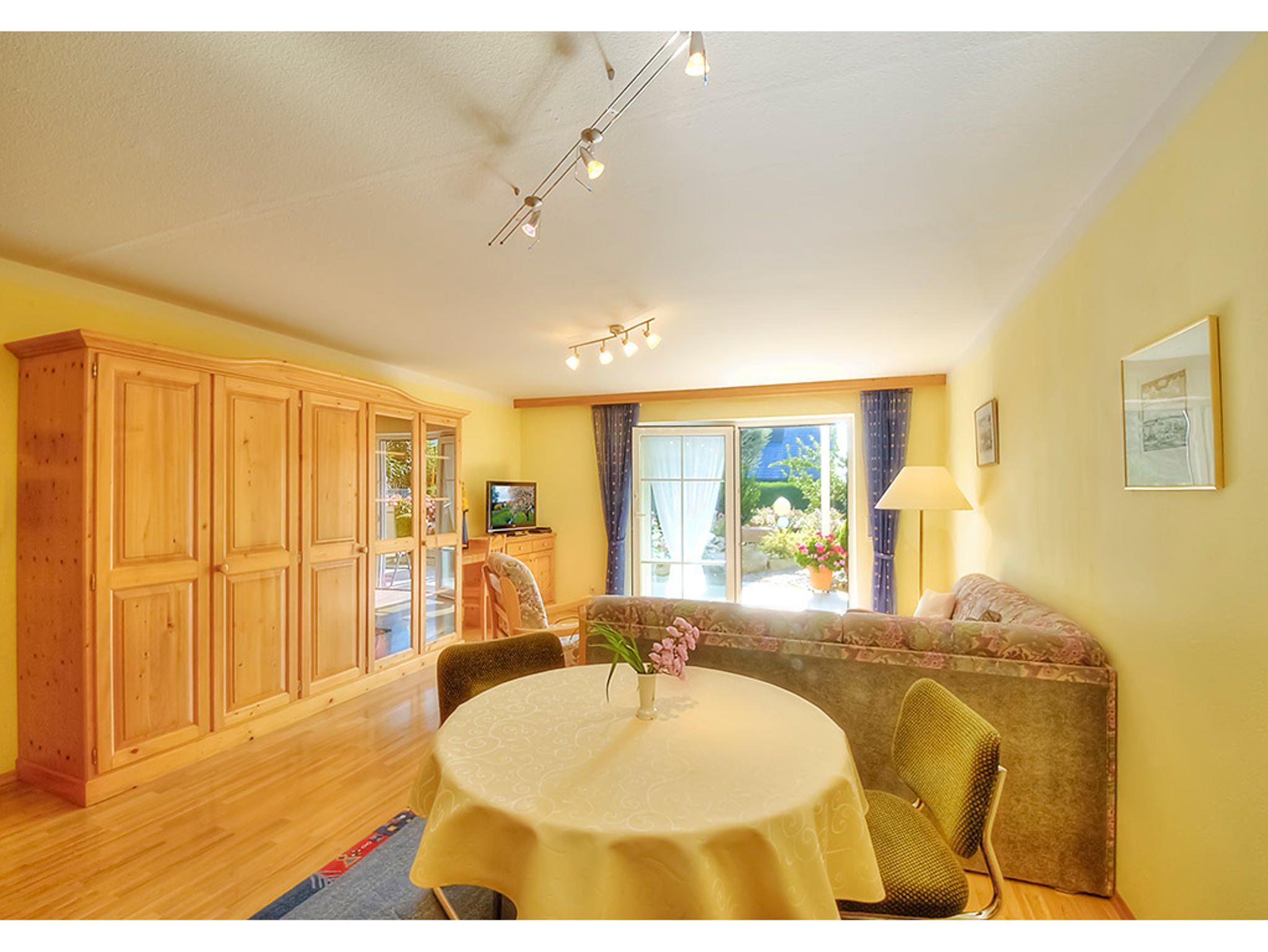 Die Ferienwohnung mit Gartenblick verfügt über Fußbodenheizung, einen direkten Zugang zur Terrasse, eine voll ausgestattete Küchenzeile mit großzügigem Essplatz, ein gemütliches Wohnzimmer mit Flatscreen und SAT-TV, modernes Badezimmer mit Dusche sowie ein Schlafzimmer mit Doppelbett. Schlaf- und Wohnräume sind getrennt.