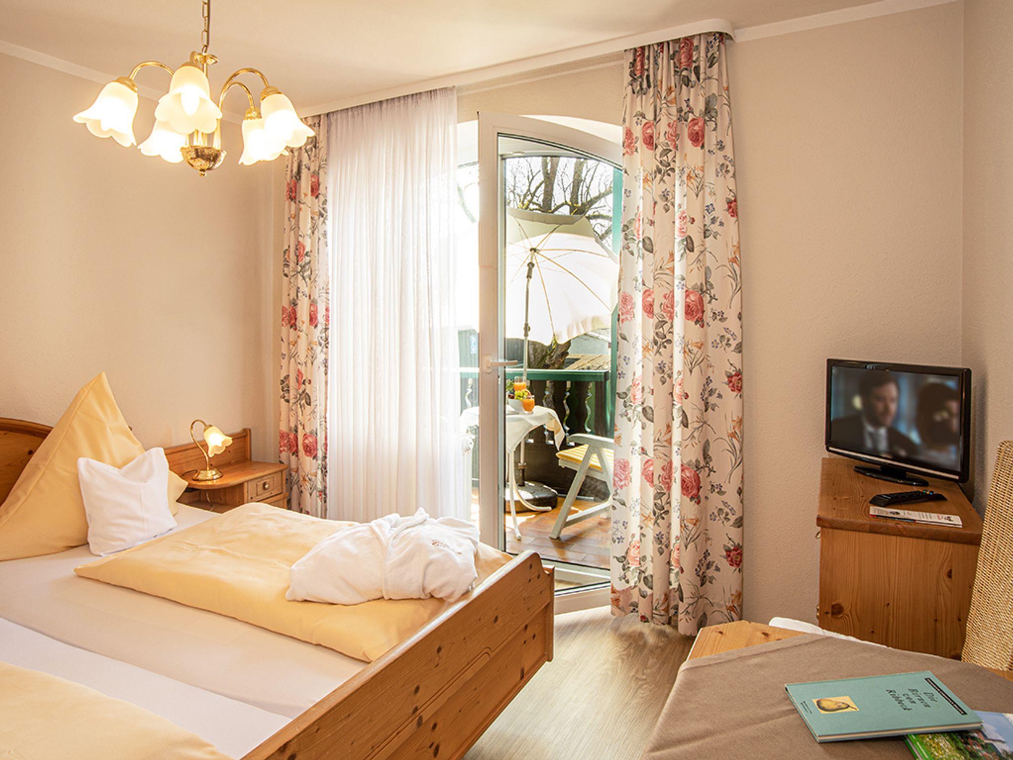 Unsere modernen Doppelzimmer im Obergeschoss (24qm) verfügen über ein Doppelbett mit getrennten Matratzen, eine kleine Sitzgelegenheit, Sat-TV und kostenfreies WLAN. Im Bad mit WC und Dusche sind natürlich Handtücher und Kosmetikspiegel vorhanden, ausserdem stellen wir ihnen gerne einen Fön zur verfügung. Auf dem gemütlichen Balkon zur Südseite hin können Sie abends entspannt die letzten Sonnenstrahlen genießen. Weiterhin gibt es Brötchenservice, Frühstücksbuffet, Parkplätze und einen Fitnessraum. Darüber hinaus können Sie Sauna, Solarium und Liegewiese nutzen. Die hauseigene Massagepraxis bietet das gesamte Spektrum der physikalischen Therapie zuzüglich Fußpflege. WLAN ist in allen Bereichen nutzbar und ist kostenfrei. Die Rottal Terme ist ca. 1 km entfernt und in 3 Minuten mit dem Auto zu erreichen. Das Doppelzimmer ist aufgrund des vorhandenen Hartbodens gut für Allergiker geeignet.